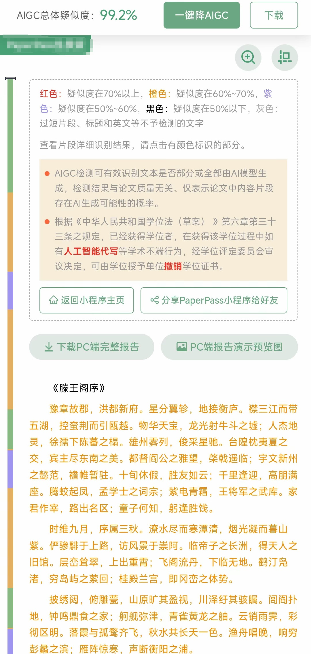 甚至有人把《滕王阁序》塞进去,发现其AI生成疑似度高达惊人的99.2%。