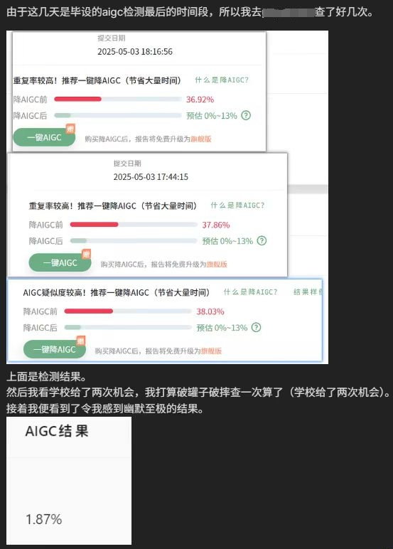 事情是这样的,今年很多学校为了防止学生用AI写毕业论文,在论文送审时加了一项“AIGC检测”,意思就是检测你文章里多少内容是由AI生成的。