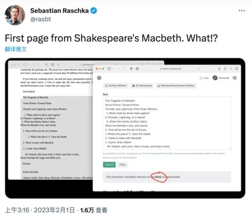 像OpenAI在ChatGPT刚发布时,就推出了自己的AI文本识别工具AI Text Classifier。但准确性就很拉了,只有约26%,还把莎士比亚的作品当成AI生成的。。