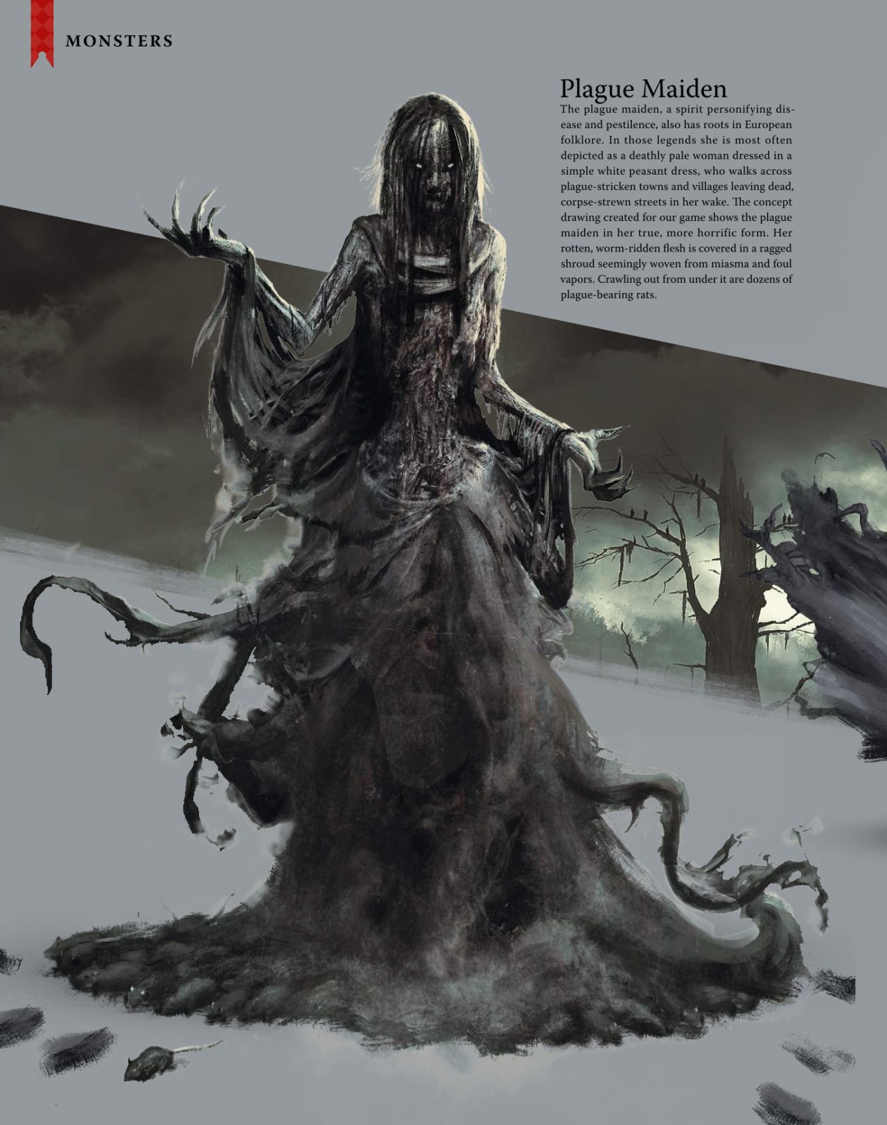 遊戲中呈現了她真實的恐怖形態——潰爛的軀體爬滿蛆蟲,身披彷彿由瘴氣與腐臭煙霧編織而成的襤褸屍衣