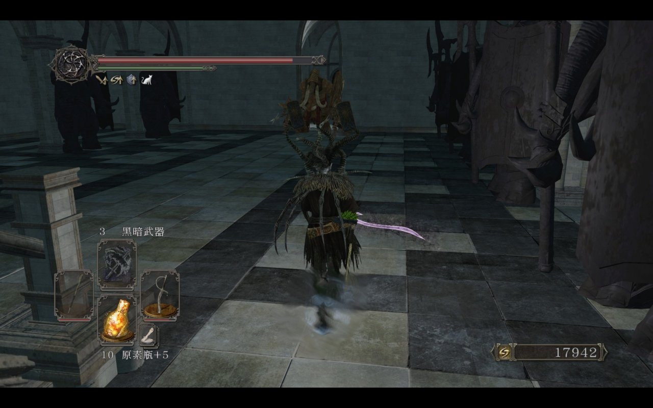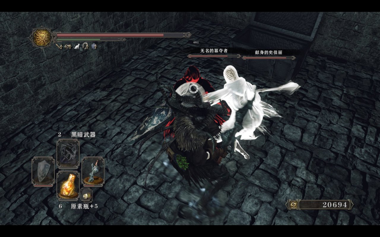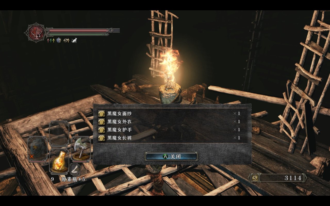 由于原版没有废渊居民的入侵,因此黑魔女面纱只能通过sl太阳钟楼的暗灵才能获得;