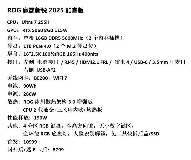 ROG已经上架并公布了5款不同配置RTX 5060游戏本的价格,分别如下