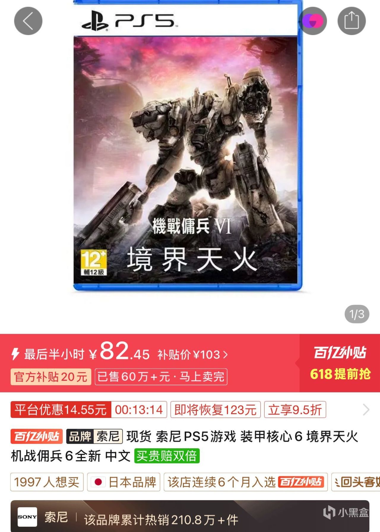 4.PS5遊戲《裝甲核心6境界天火》港版中文82.45元全新包郵,該作屬於崩盤遊戲常客了,目前在80元大關徘徊,距離50元包郵解君愁還有一段距離,屬於硬核玩家喜歡的作品,僅推薦裝甲核心系列玩家入手。