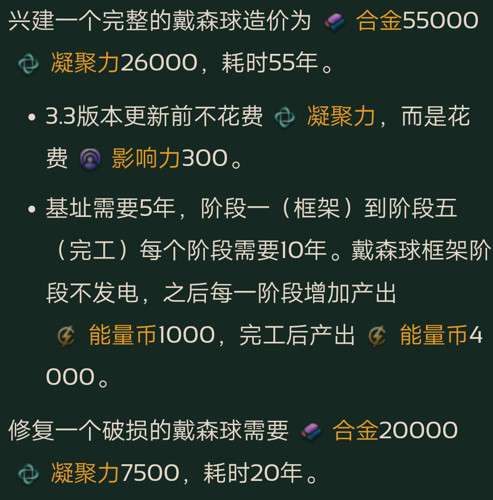 兴建一个戴森球所耗费的时间与资源成本极其之高,耗费55k单位的合金,26k的凝聚力,并且还要再搭上55年的时间去建造。这种时间成本与资源是小帝国所望尘莫及的。