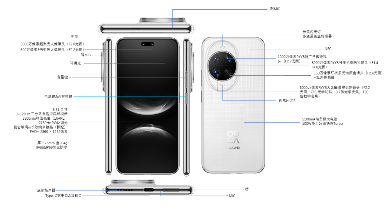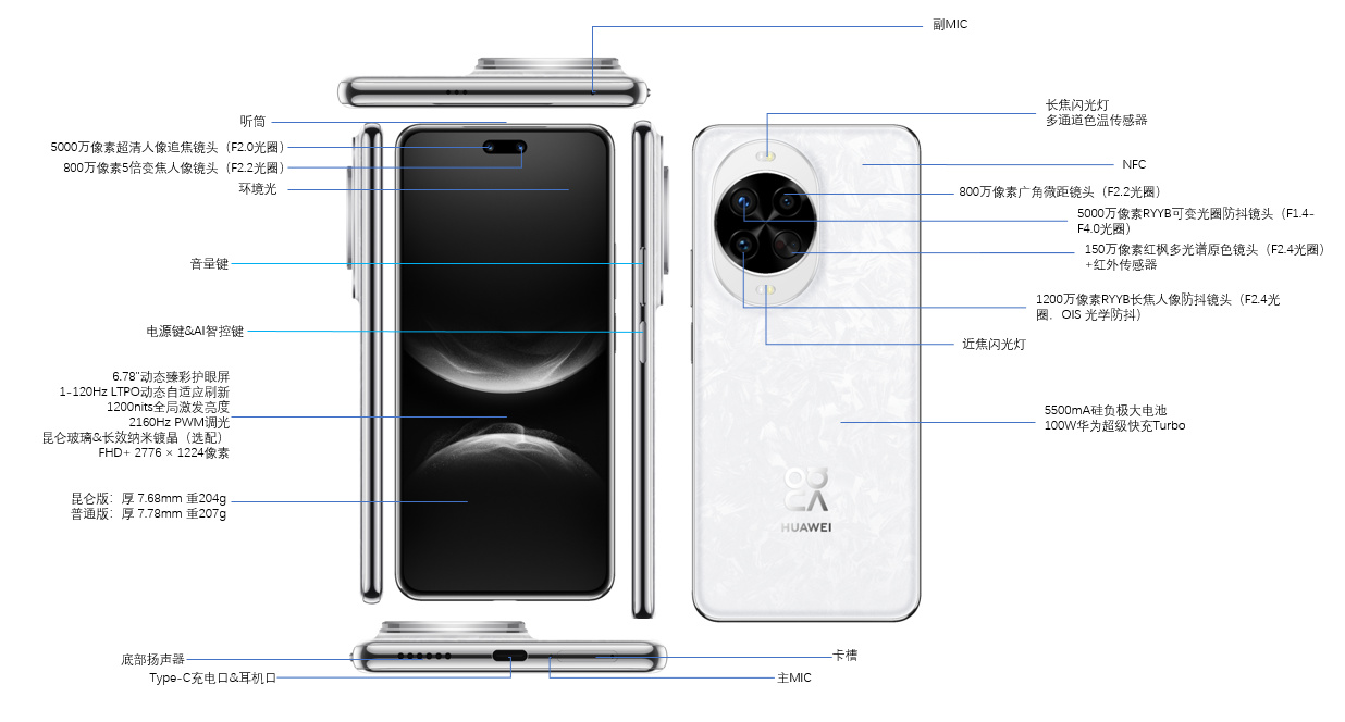 其他:双扬声器,侧边指纹,USB2.0接口,双频GPS四频北斗,IP68+69防尘防水,支持红外遥控,天通卫星通话+北斗卫星图片消息,昆仑玻璃;