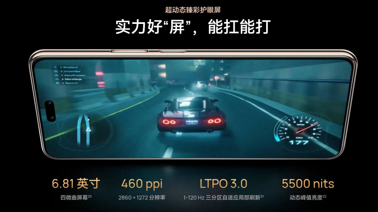 屏幕:6.81英寸 1.5K 120Hz 等深四曲屏,支持LTPO,低亮度2160Hz PWM调光;