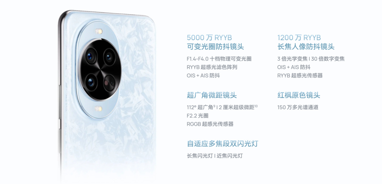 RYYB主摄:50MP 1/1.56", ƒ/1.4-4.0可变光圈,支持OIS;