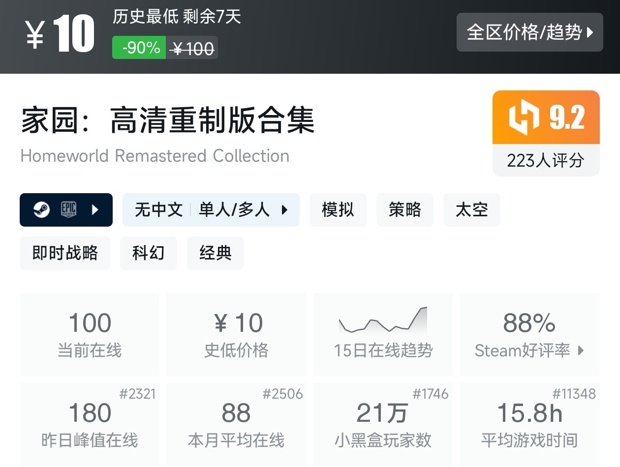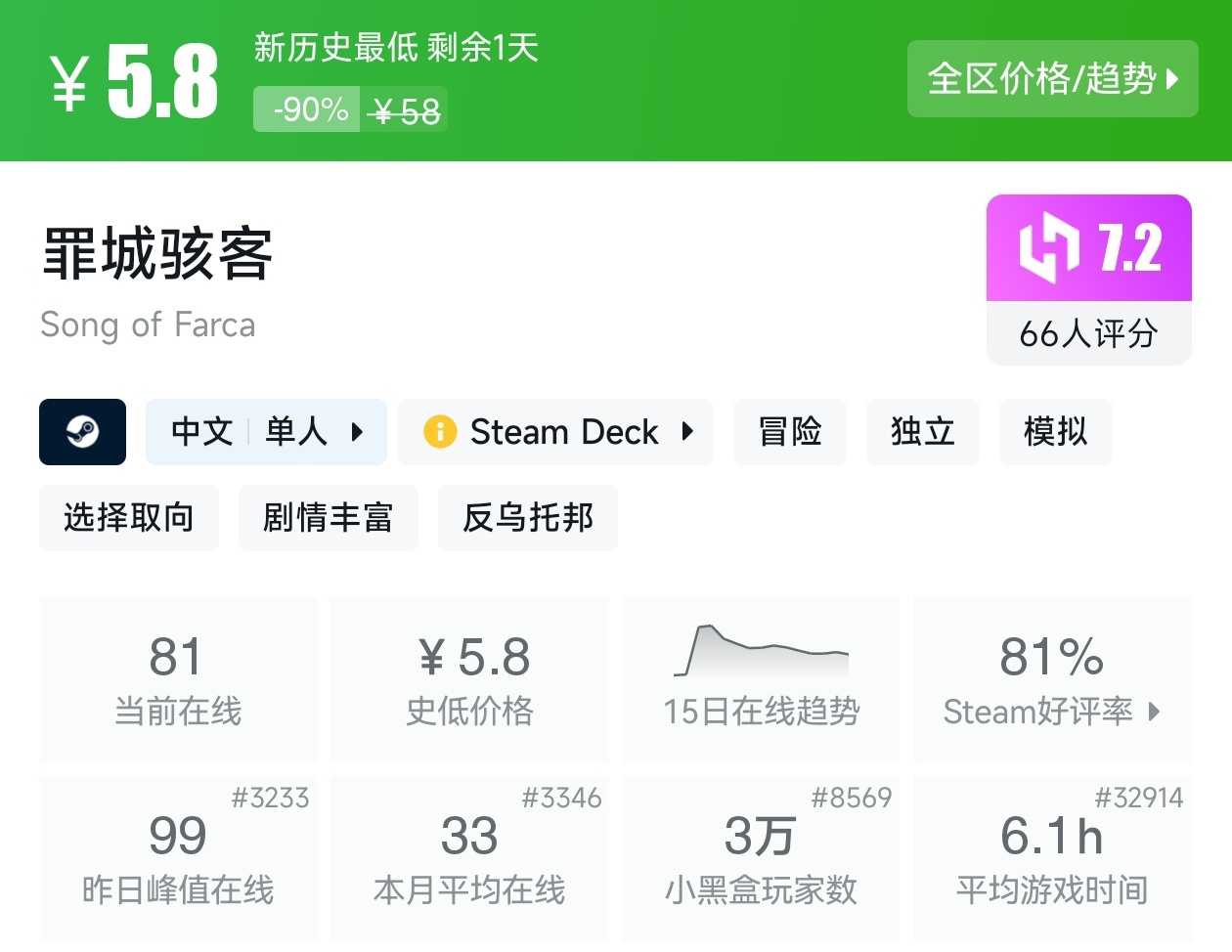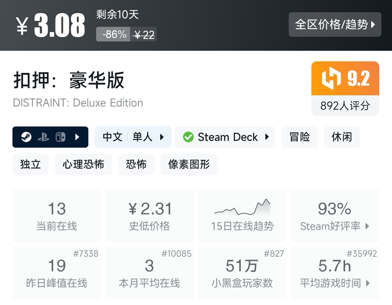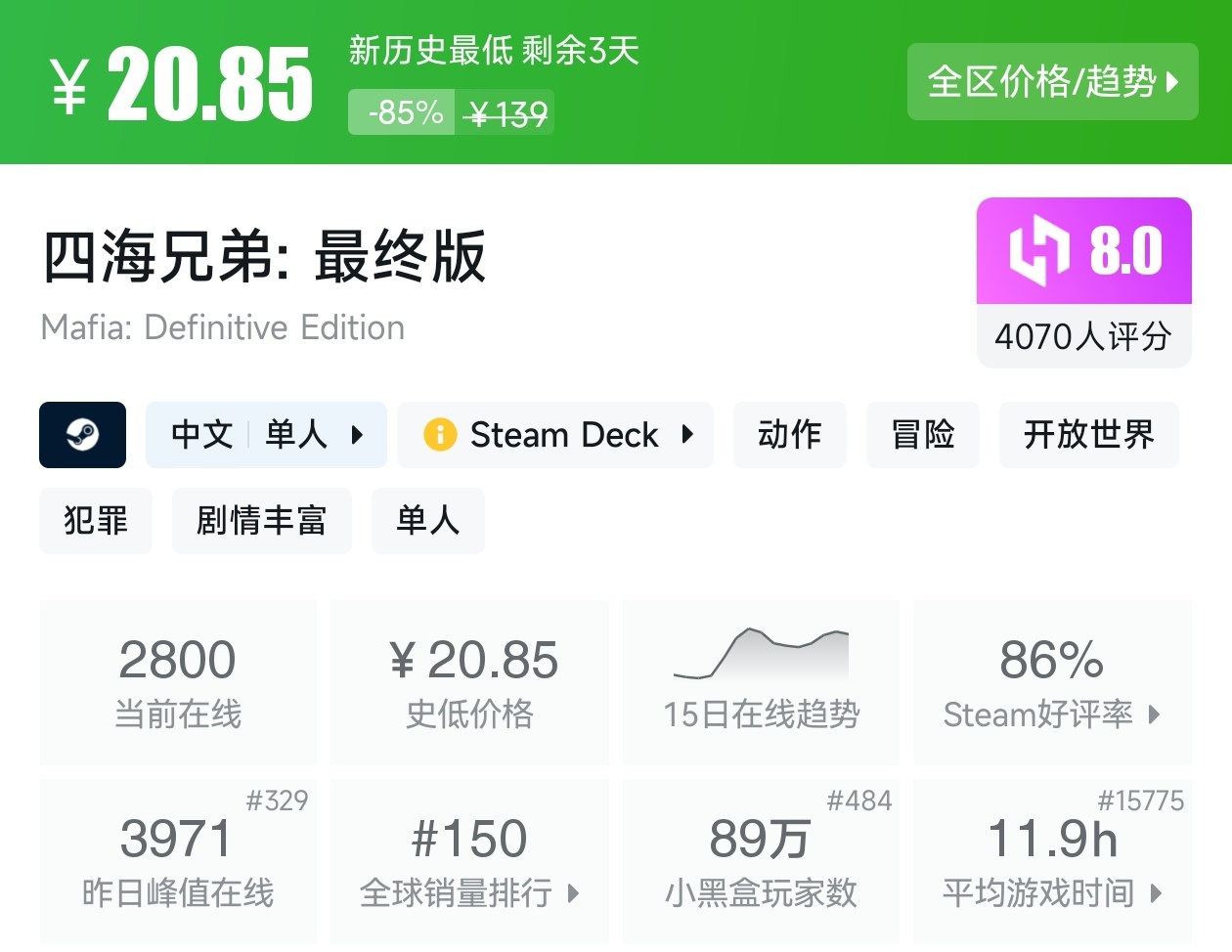 雖然標準版史低爲14.9元,但我還是推薦完全版,有石之心和血與酒DLC,質量很頂,遊戲還迎來了上線10週年。