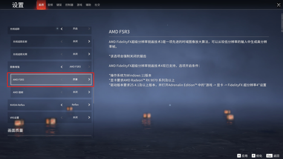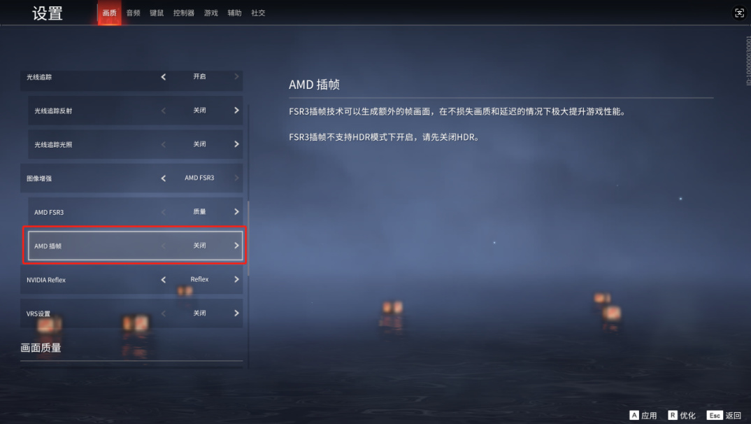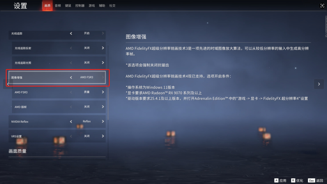 在永劫無間 設置 - 畫質頁 - 圖像增強選項中選擇 AMD FSR3/FSR4,啓用AMD插幀選項