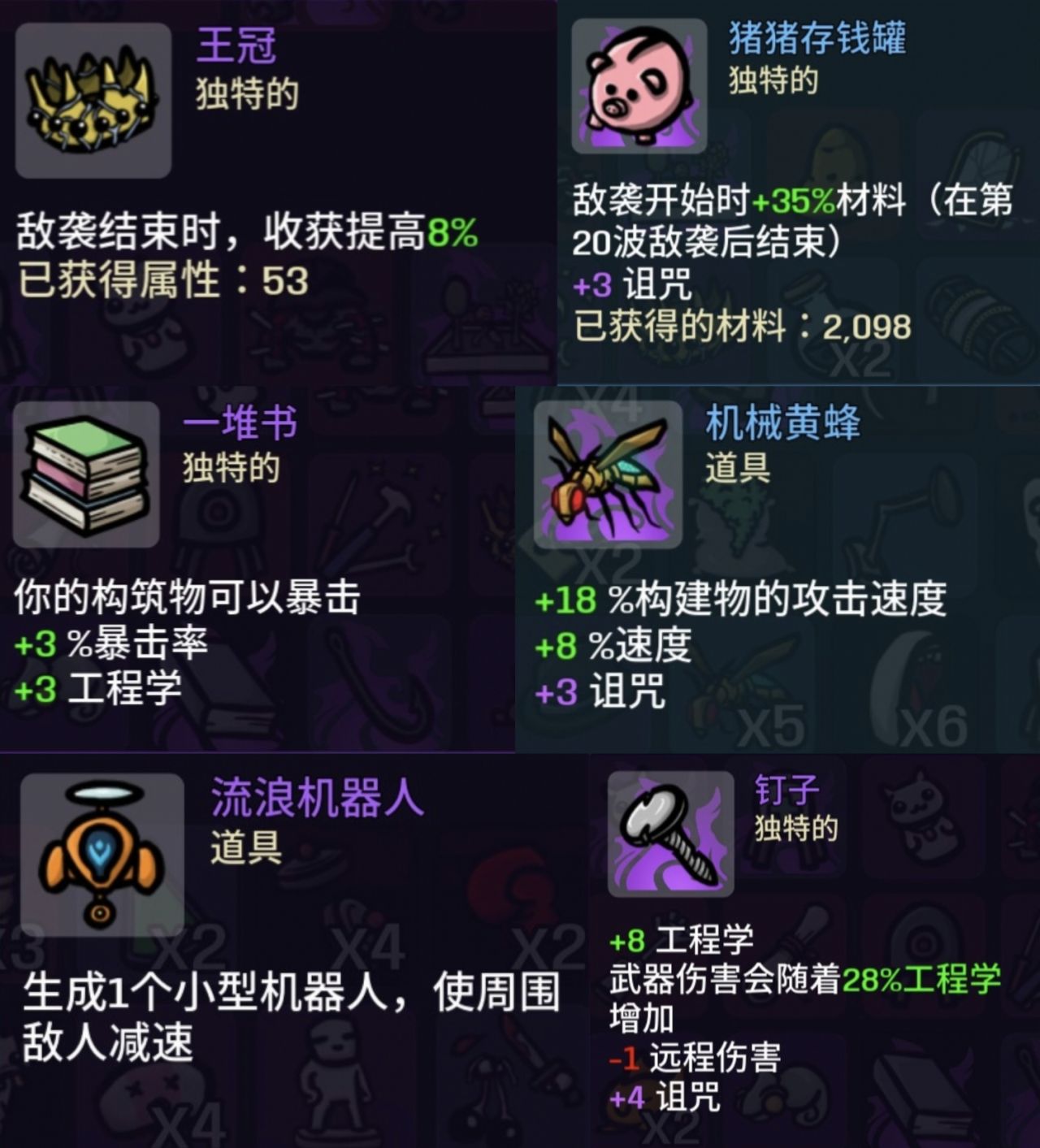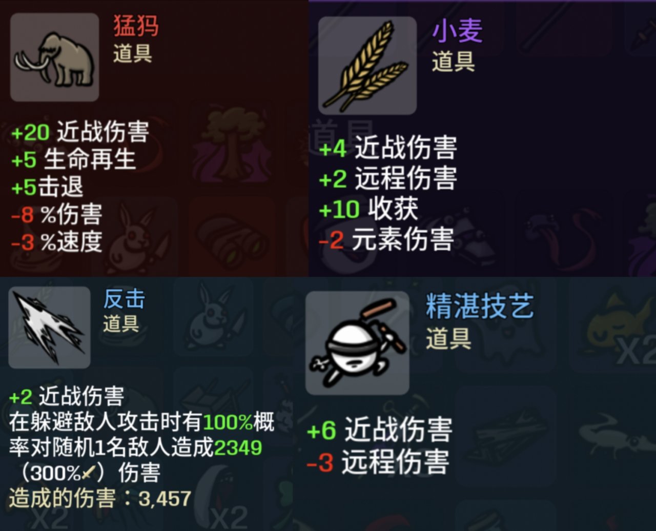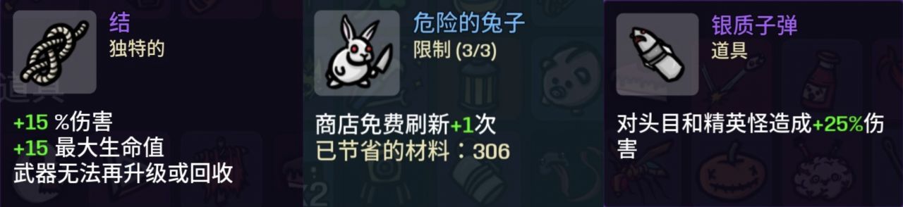 伤害的修改增加33%→只拿+伤害的道具,因为你也不能保证自己下一波拿到的是什么武器,所以找+元素/近战/远程伤害的武器都没有用