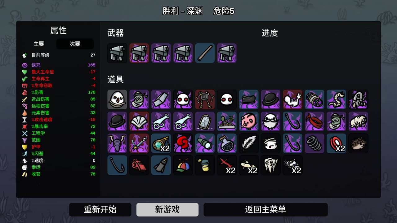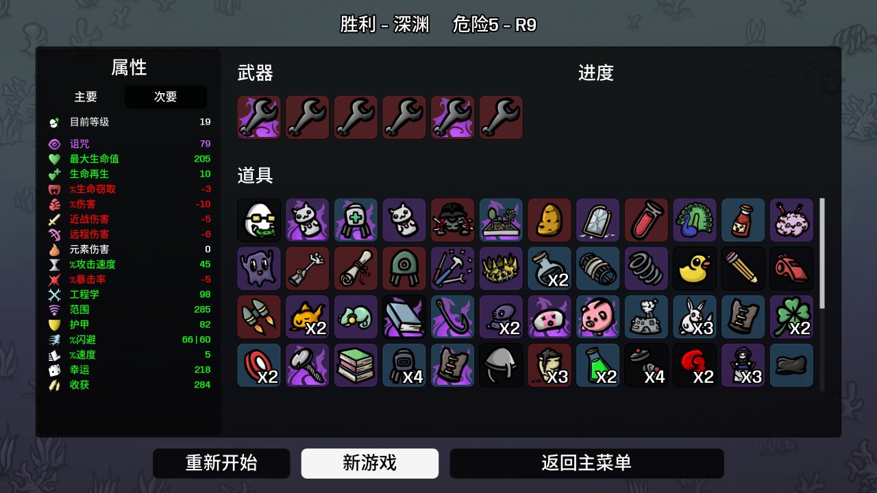这把是真给我打爽了,你们可以看我的通关面板,我这是继DLC更新后,第一次拿到3鱼钩,而且其中有2个还是被诅咒的,前期就拿到3鱼钩了,直接中期开始遇到好的直接锁等下一波,你们也可以看到我几乎全是被诅咒的道具,真的是给我打爽了