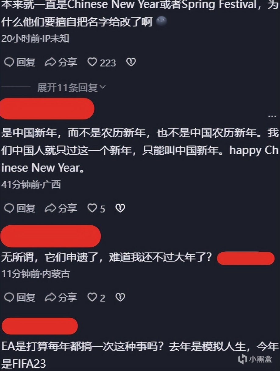 目前,EA官方已經修正了這次任務,任務已經標註爲“農曆新年”。EA及時意識到自己的錯誤,及時在遊戲中修改錯誤,態度還是挺誠懇的。但是此事在新年期間發生,而且已經持續發酵幾天,難免影響中國玩家對EA旗下游戲的看法。EA此前的《FIFA22》和《模擬人生》都出現過類似的“原則性翻車”事件,再加上這次的“韓國農曆新年任務”事件,希望EA儘量避免發佈爭議性的內容。如何看待EA的這次“韓國農曆新年任務”事件?歡迎討論。文章最後附上一些中國玩家,對本次事件的看法。以上就是本篇文章的全部內容,感謝閱讀。