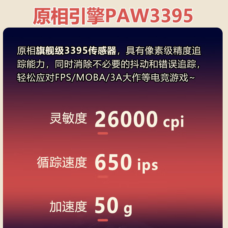 配置方面,R72采用的是PAW3395,DPI峰值26000DPI,支持650IPS和50G加速度,还有熟悉的2档响应高度。属于能带你到大师段位的性能。