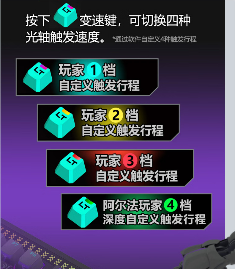 阿尔法光轴还可以跟磁轴一样调节触发行程,从0.8mm到3.0mm都是可调范围,可直接使用出厂预设,按下LT变速键,即可切换四种光轴触发速度。同时还有RT功能。