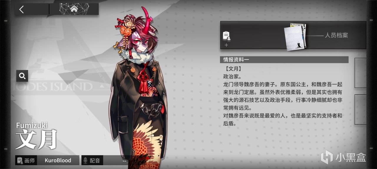 文月,原东国公主,随魏彦吾定居龙门。她外表优雅柔弱,实则拥有强大的源石技艺与出色的政治手腕,行事冷静细腻,极具远见,是魏彦吾最坚实的后盾与挚爱之人。与热衷武艺的魏彦吾不同,文月夫人的爱好十分 “狂野”,作为机车党成员,常能在龙门外环看到她风驰电掣的身影(详见星熊干员密录) 。