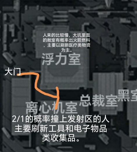 另一个选择就是前往资源较多而且地形复杂不容易被彻底堵死的离心机室(二楼货架旁边刷燃料)但是这个地方有着较高的风险,因为发射区的人直接往核心区跑的话他们只有两个资源点分别是黑室和离心机室。一般来说都会选择去黑室架枪吃航空箱小保险还有看两个刷油点,但是不排除会有人不想搞这些就想相对安全的搜东西从而来离心机室与你遭遇。