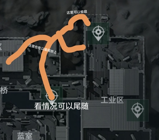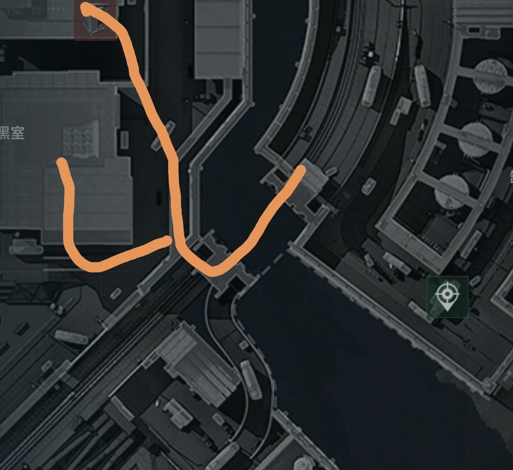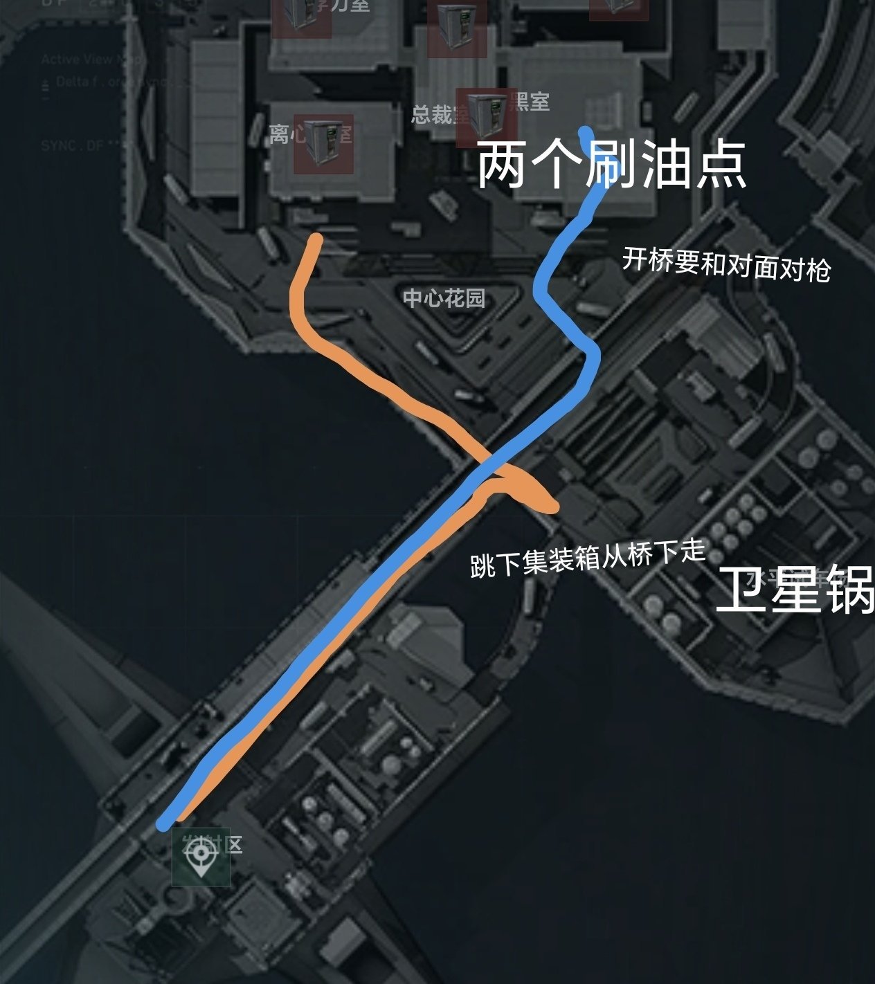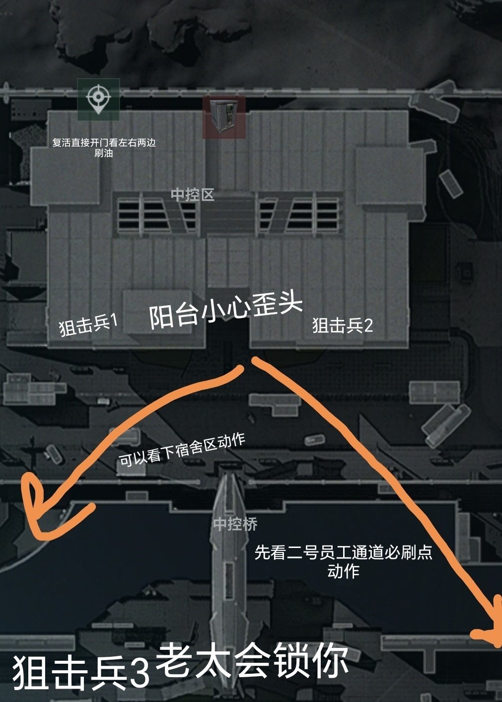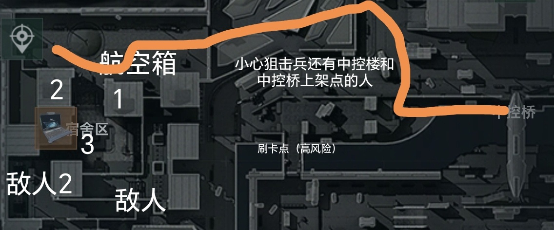 胆子大的话可以一边吃周边三栋楼的资源点(三栋楼的桌台上均会刷新卫星锅和房卡)一边听脚步如果有人来了再跑,胆子小的话可以直接吃完一号楼外的航空箱然后进去看看桌子上有没有卫星锅之类的东西然后按照图中黄标路线直接往中控桥下方向跑伺机滑索进入核心区,(可以刷员工通道卡进核心区但是有极高风险可以封烟尝试)第一时间直接往那边跑的话,西区大门刷新的人一般不会注意到这边而是选择慢慢走到宿舍2-3号楼附近搜寻敌人,如果跑的路上看到了中控楼的人滑索过点的话也可以进中控楼捡垃圾,因为中控楼一般吃不太干净。