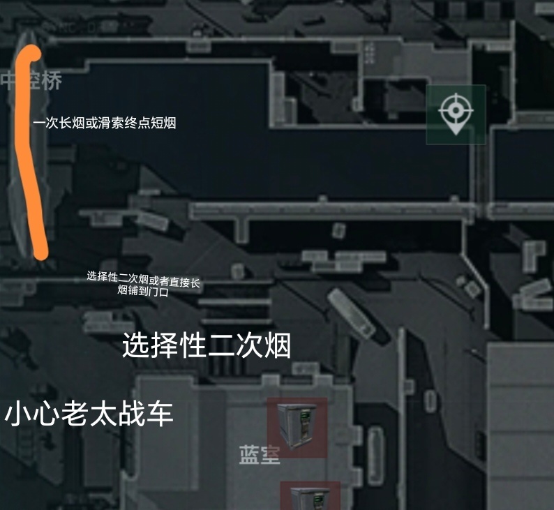 在进到蓝室或浮力室之前的我们时时刻刻都是处于危险之中的,在过桥之后由于两边地形都是复制粘贴的所以就只拿蓝室举例子了。过桥之后的第一次攀爬位很容易被打死建议由此封烟再过去,只要到了核心区门口我们基本就是安全的了不用担心被打死只需要面对人机就好了。