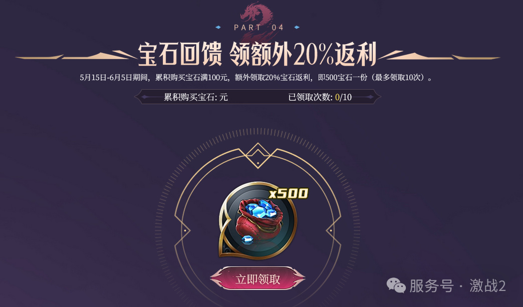 寶石黨福音!——活動期間充值寶石,額外獲贈20%寶石返利!(每購買100元寶石,可額外領取500寶石1次,最多10次)