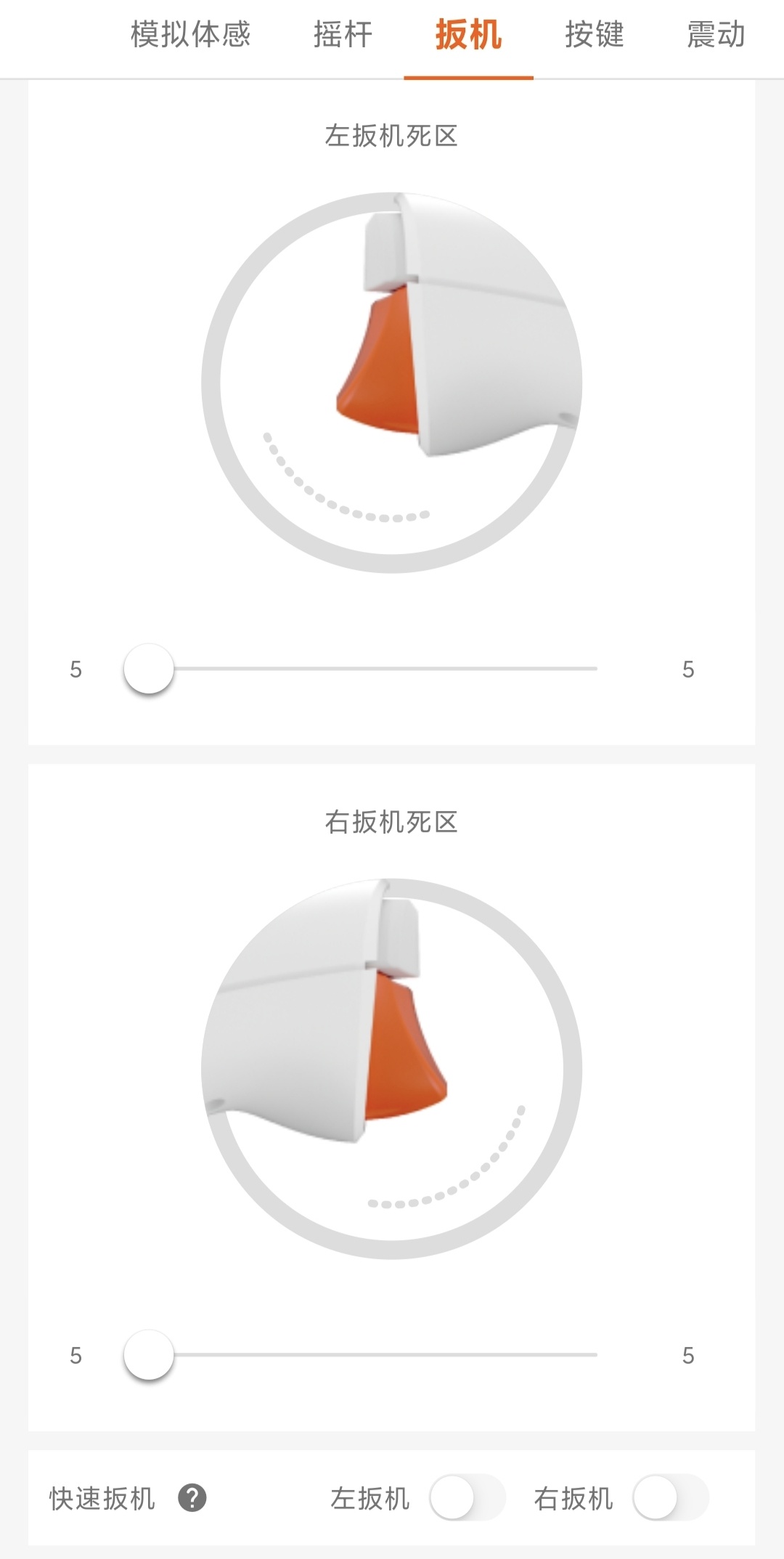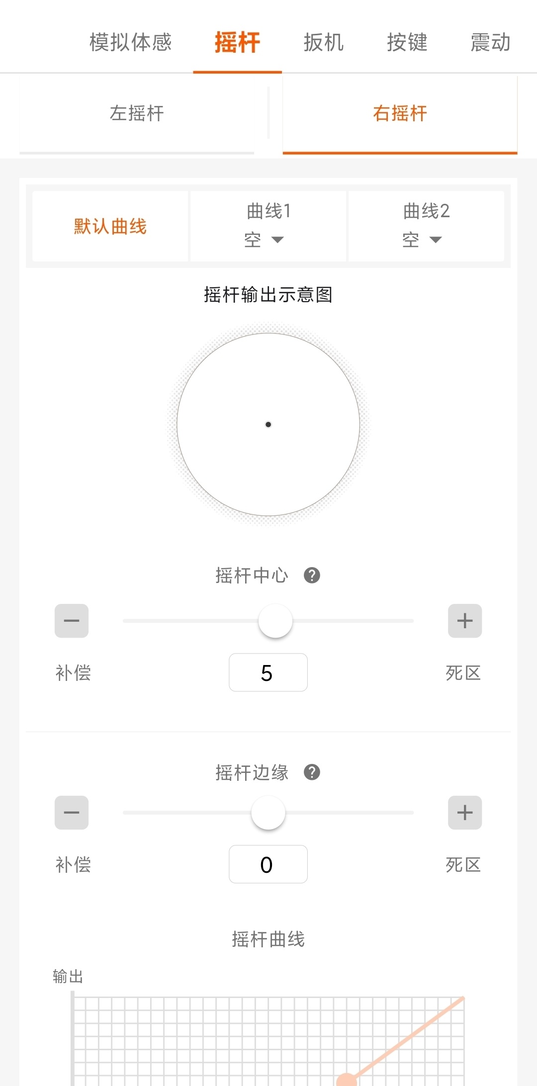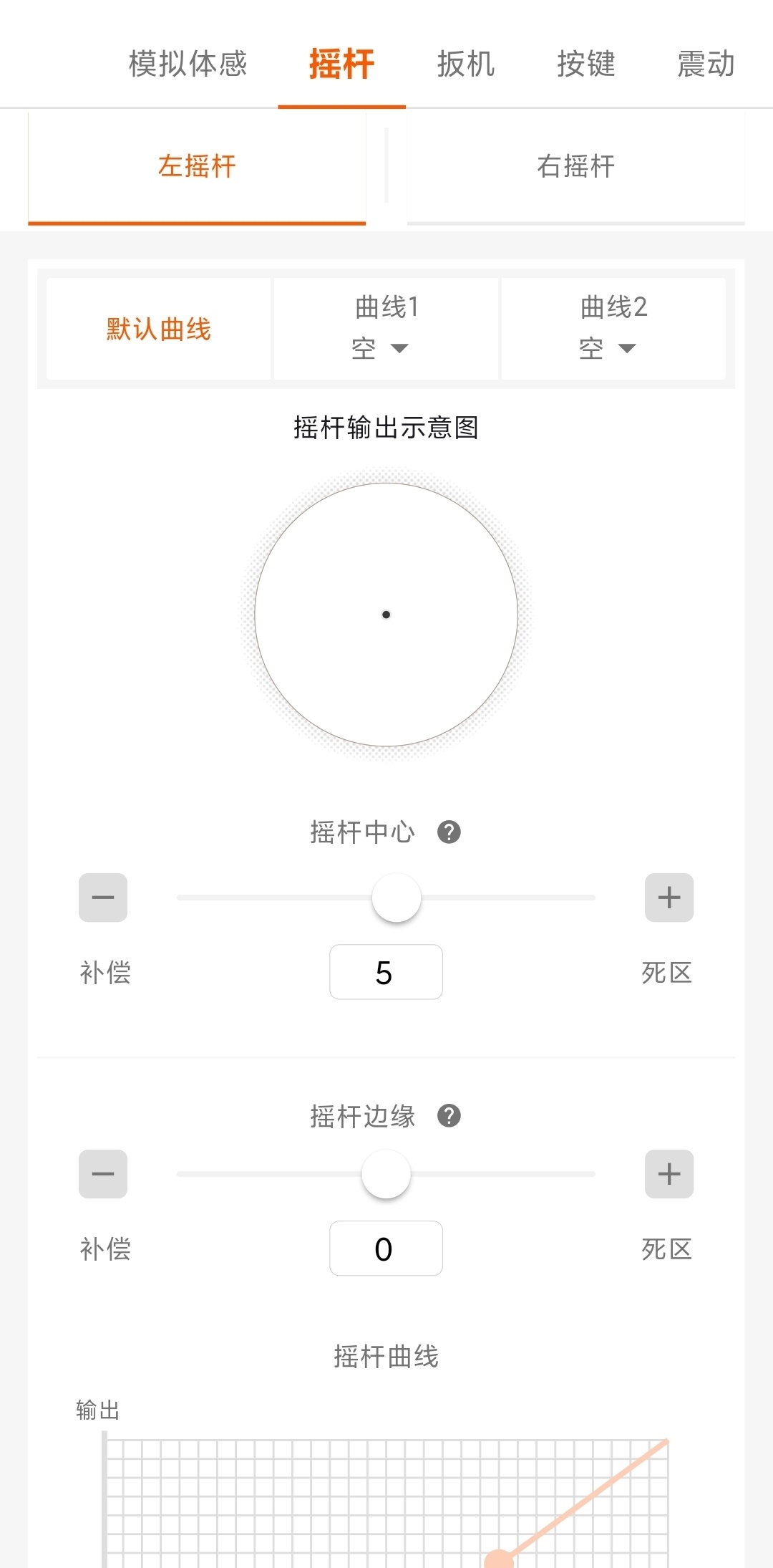 我感覺墨將手柄的搖桿阻力比較大,習慣了xbox精英手柄二代可調的三檔阻尼,它更偏向中檔,所以我把左右搖桿的中心都設置成了5,邊緣設置成了0。確保輕微操作能被識別,且不會飄移,不同手柄可能飄移值不一樣,我在靶場反覆測試,4會飄移,搖桿曲線默認沒有動。