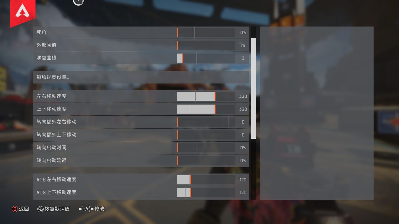 我以前習慣線性43,發現轉向略有一些啓動延遲,因此330靠近線性43的鏡頭移動速度,也關掉了剩下的幾項,保證搖桿能隨時推動到我想要的視角