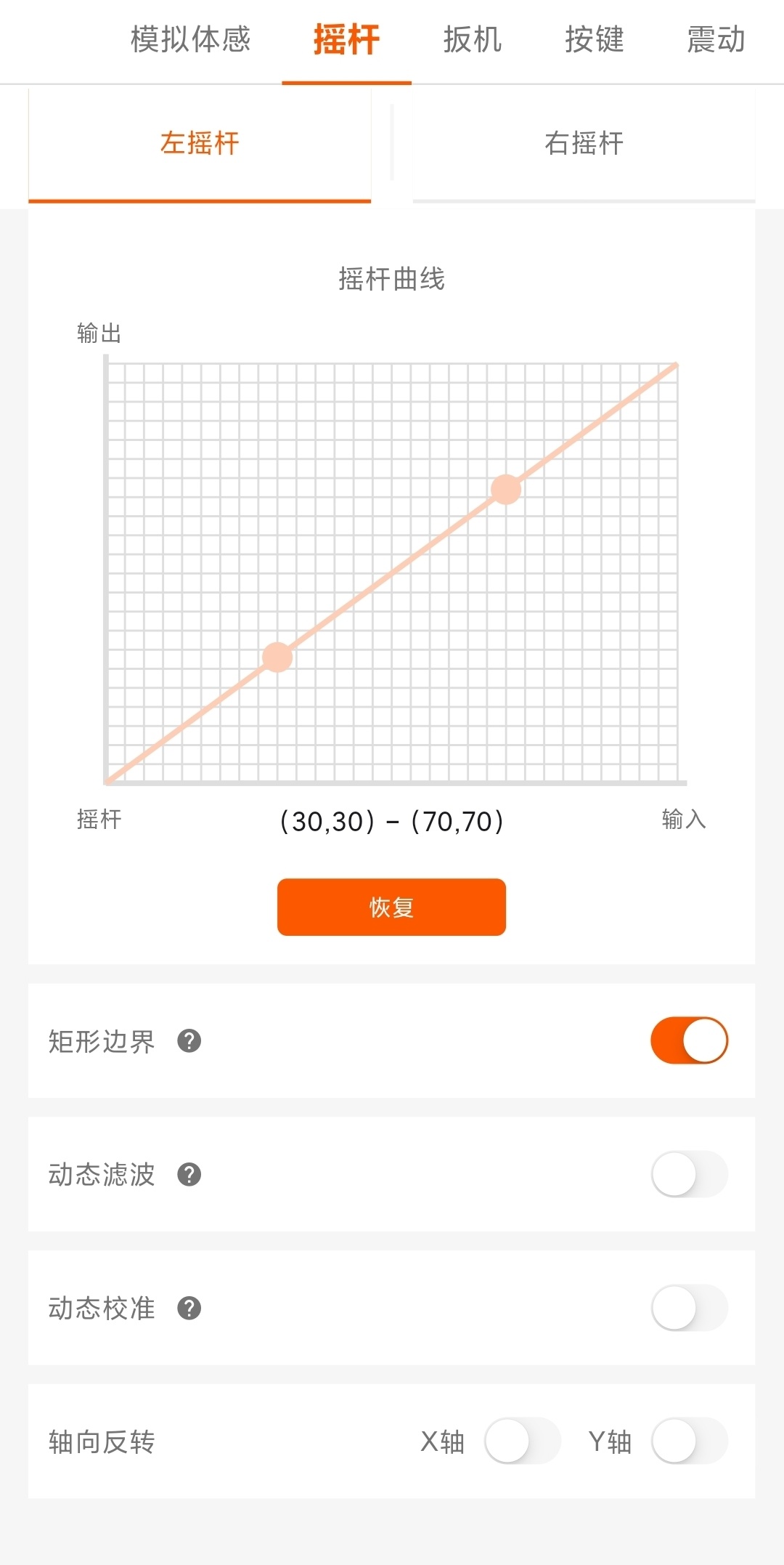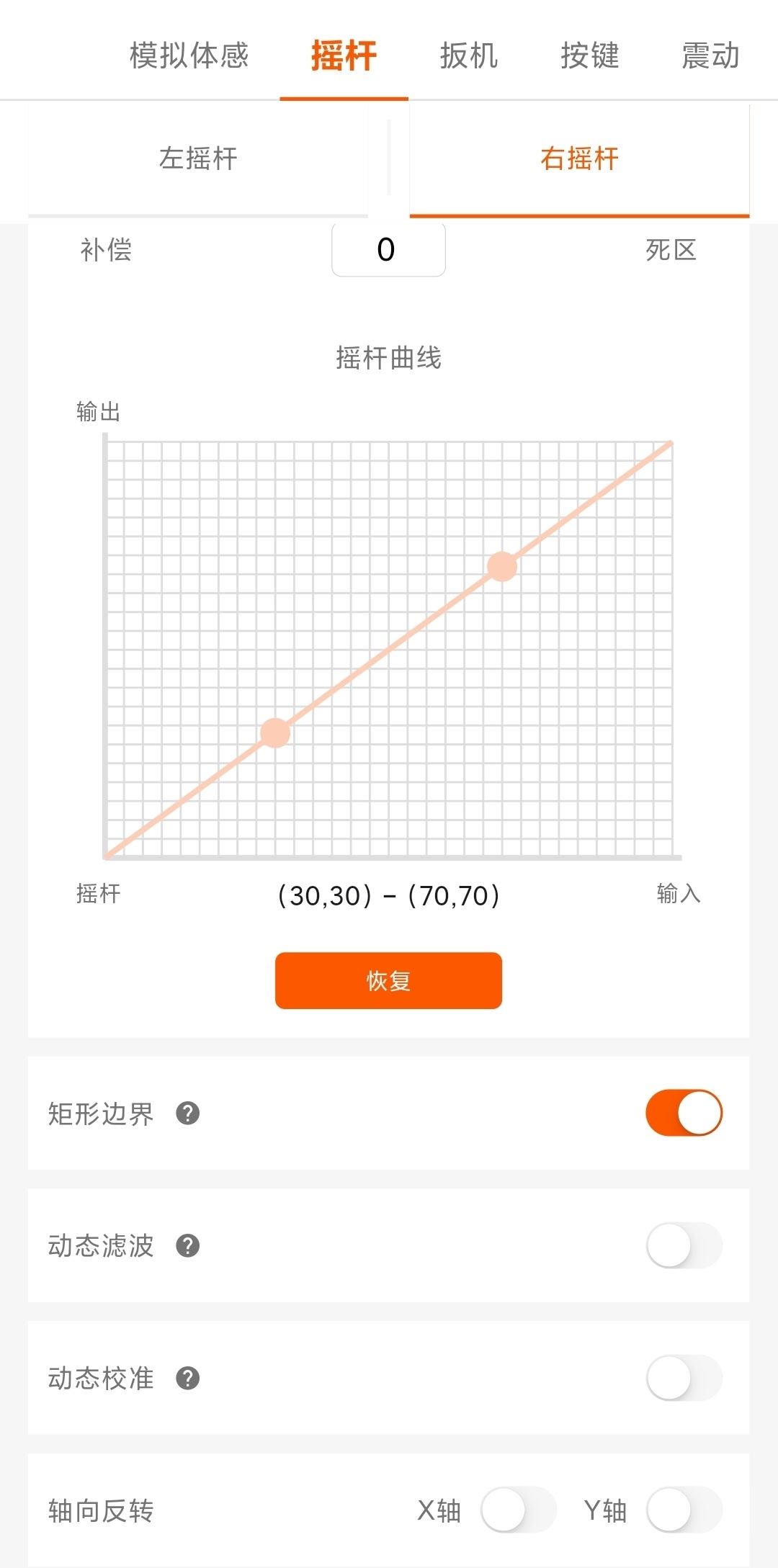 矩形邊界開,其他兩個關,原理我查閱了一番,得出結論:更符合原生手柄的感覺,更跟手,但也更考驗玩家搖桿控制水平。