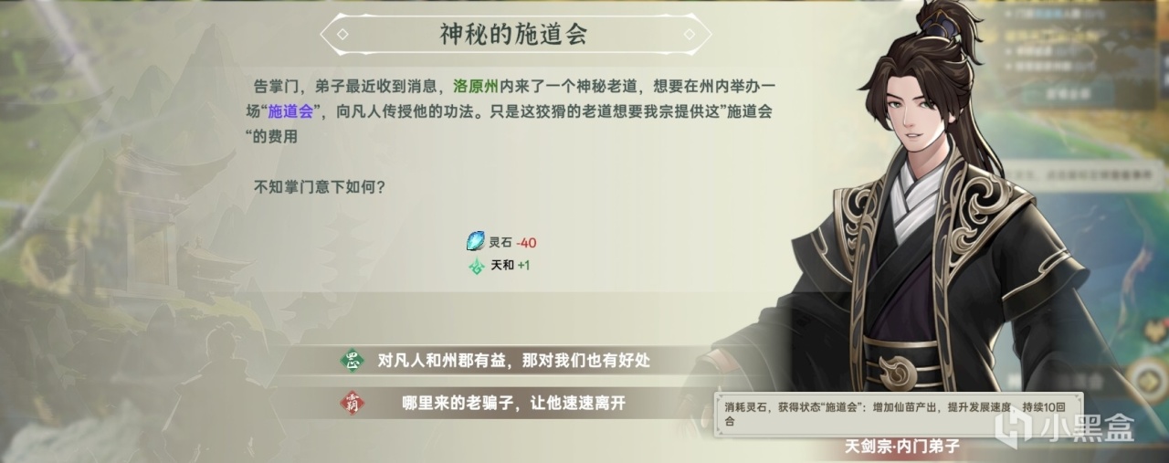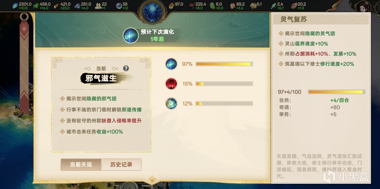 比如“靈氣復甦”可以加快靈山的蘊養和低階弟子的修煉速度,但會阻礙州郡的發展,而“邪氣滋生”則會讓三觀不正的宗門開始傳播邪道,無人駐守的州郡會更容易被妖獸入侵,但城鎮發佈的擊殺任務獎勵翻倍。即意味着,根據天運去決定自己接下來多個回合的戰術,無疑有助於順風而行。