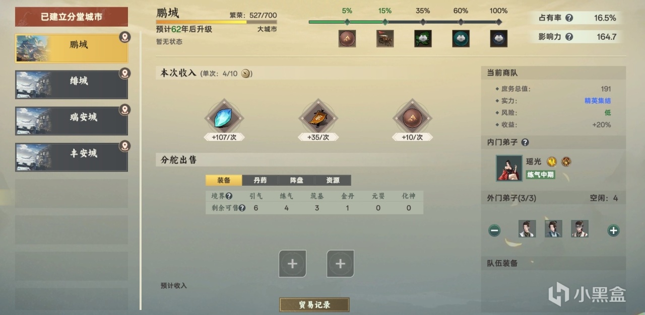 而《宗門志》當前的第二個問題則在於資源體系的運轉平衡,貿易商路以及商會帶來的收益,不論是數量還是穩定性都比其他活動有着更高的優先級,但行商又需要消耗大量的弟子,需要1個內門弟子帶隊3個外門弟子才能夠收益最大化。