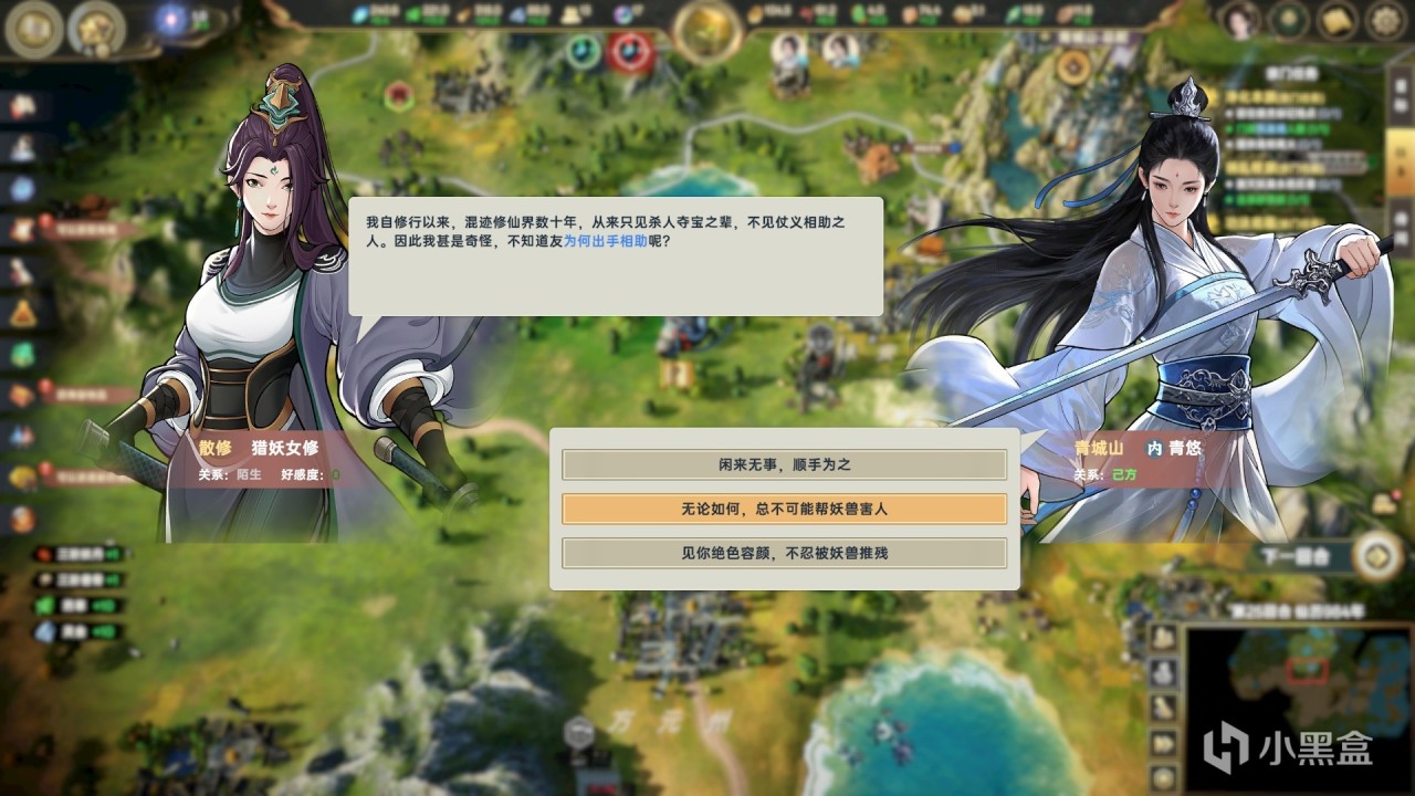 以及在運轉過程中,州郡也會時不時地冒出各類隨機事件,宗門對其的不同態度和選項最終也會引來不同的資源增減與屬性變化,雖然放在4X的玩法框架中顯得聊勝於無,但從服務於修仙世界沉浸性的角度來說,還是或多或少有所加分的。