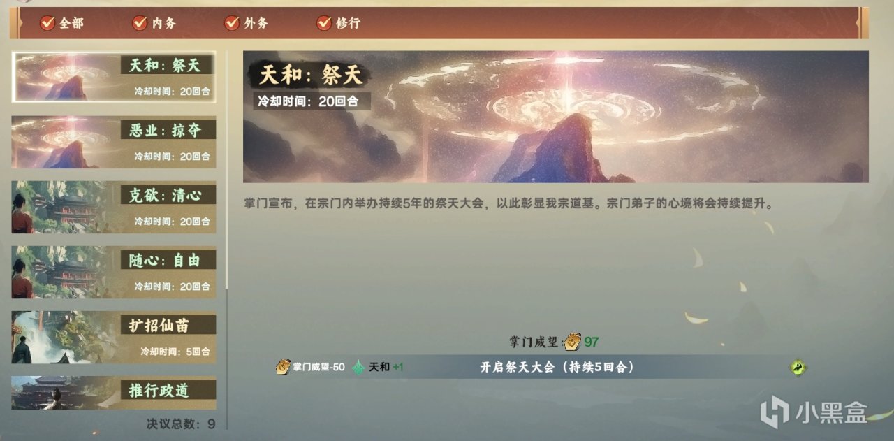 開局的教程只會把遊戲最淺層的打法思路提交給你,如何學習到更深層的機制和玩法,在很大程度上需要依賴於玩家的自主探求與4X遊戲經驗的觸類旁通。比如遊戲裏有一套宗門決議機制,可以通過消耗掌門威望來換取各種短期增效,但我直到中期才發現這項機制藏在政務的次級菜單當中。