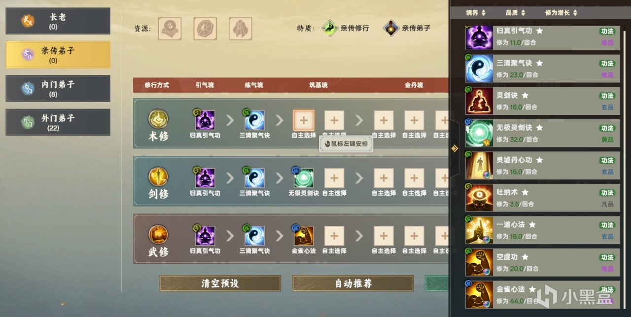 於是,個體的育成最終還是被侷限到了門內屈指可數的精英身上,因爲你註定沒有精力去完美顧轄到每個弟子的各方各面,這也是爲什麼一鍵管理門內修行和功法相當重要。