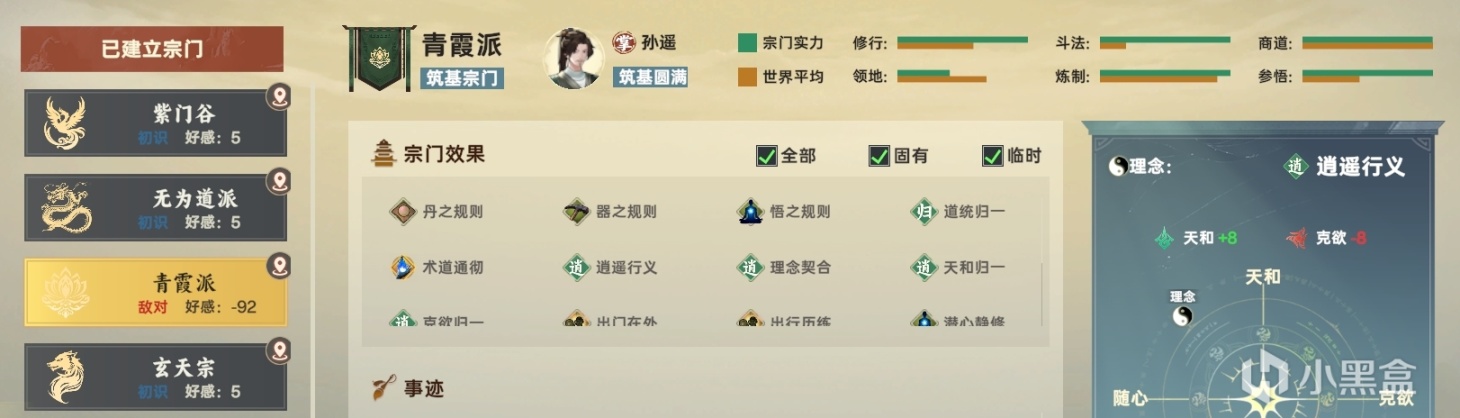 exterminate(征服)則意味着“與人鬥”的斡旋:在這片土地上不只有你這一個宗門,還會有其他宗門與你展開競爭,在這個方面《宗門志》的亮點更多地在於修仙設定這套表皮,內裏的核心基本還是同類4X遊戲中的標準框架。