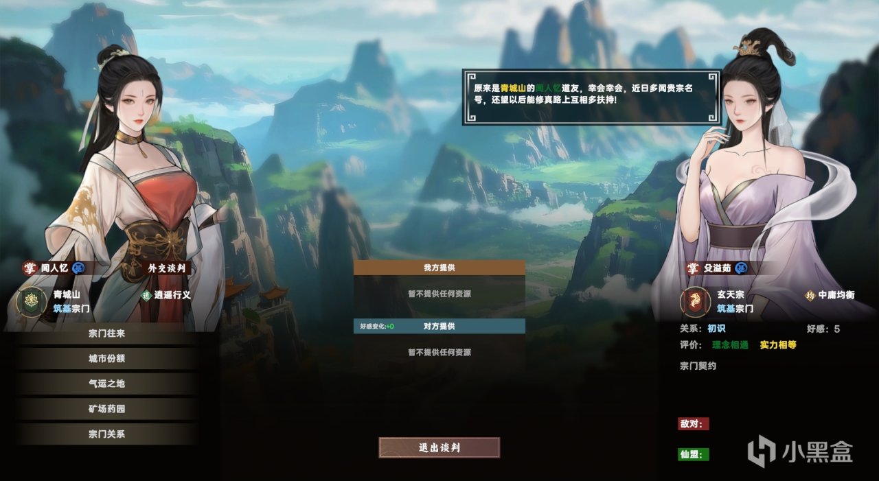 例如因爲連續搶了幾個資源點,某個宗門對我的好感度猛降至-90,關係也淪爲敵對,但卻始終沒有主動做出什麼對我有很強威脅性的活動。甚至在外事談判界面,他也還是保持着一副商業互吹的奇怪口吻。
