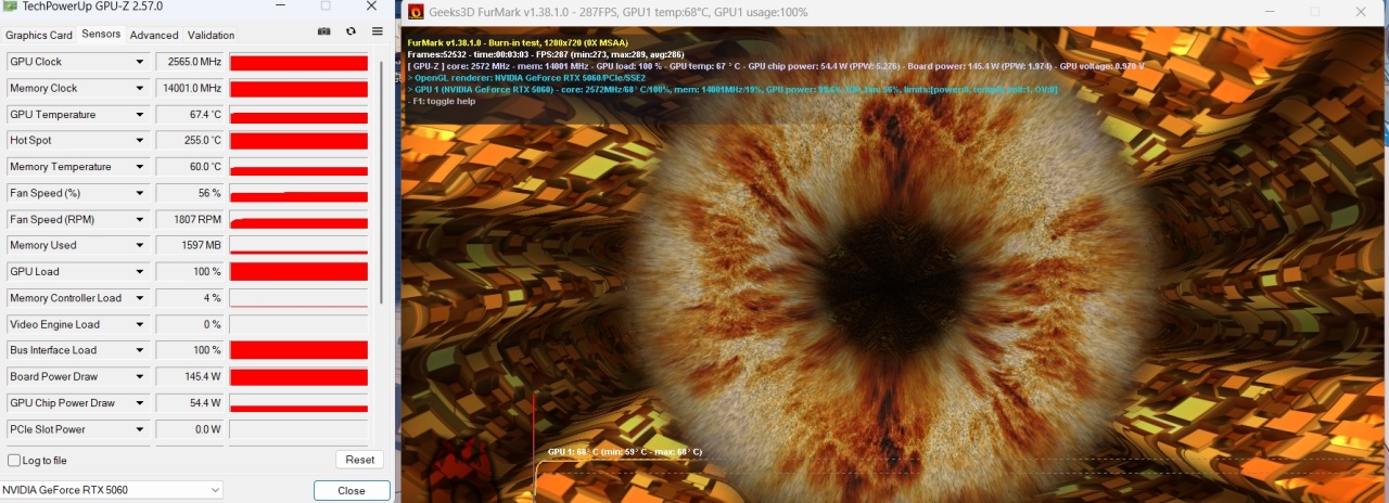 單烤RTX5060,功耗來到145W,頻率2565MHz,核心也就67℃,顯存溫度很低只有60℃