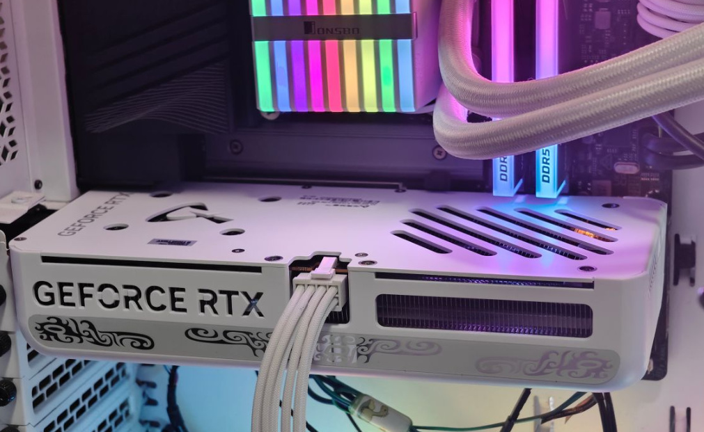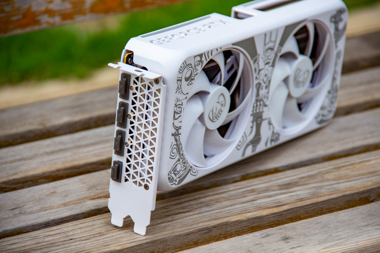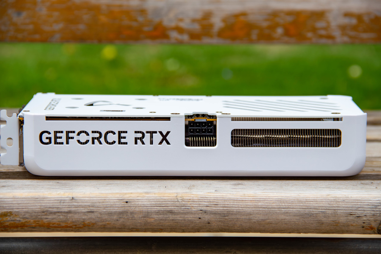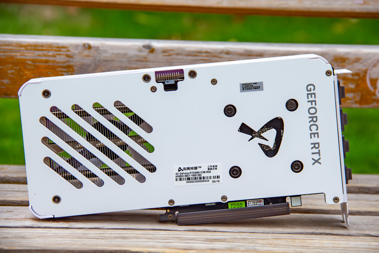 背部是純白色的金屬背板覆蓋整張顯卡,僅僅留了“AX”和“GEFORCE RTX”的LOGO。開口處用45度銳角構成折現鏤空矩陣,由於5060的PCB很短,這部分是空的,可以形成貫穿風道,給熱管加速散熱。