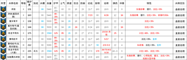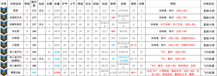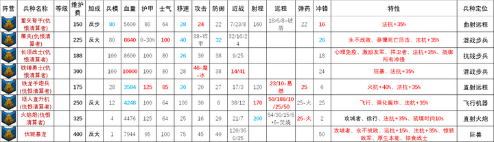 • 由於科技、戰役加成以及事務官等戰役中各類特殊數據過於複雜且統計困難,本兵種表僅略微涉及,而不做詳細的評價。