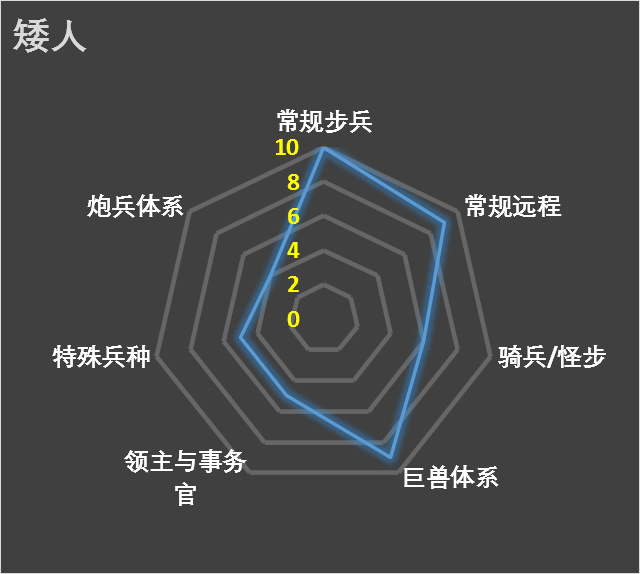 而在遊戲設定中,矮人是一個比較獨特的,基本完全以扛-射體系貫穿遊戲始終的種族。其缺少了騎兵、巨獸等中後期的強勢兵種,並代之以極其完備的扛線步兵體系,以及優秀的炮兵;同時,以獨特的直升機、事務官以及符文魔法等體系補充其中後期的兵種體系。在數值角度上,矮人兵種體系的強度並不算落後,其整體的戰役體驗也算基本合格,但若橫向對比其他種族的後期體系,矮人缺乏頂級體系和反炮手段的問題,則明顯限制了其整個種族的強度上限。
