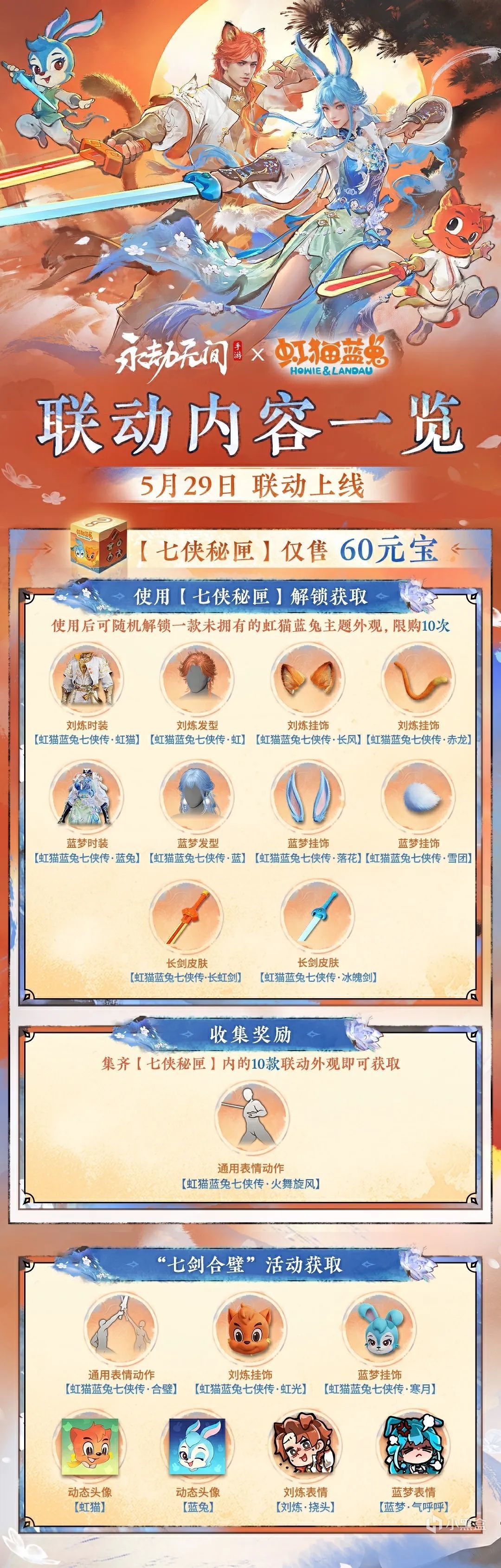 本次聯動共計10款虹貓藍兔主題外觀,均通過聯動限時盲盒【七俠祕匣】獲取,開啓後將隨機解鎖一款未擁有的虹貓藍兔主題時裝、武器、髮型、掛飾。