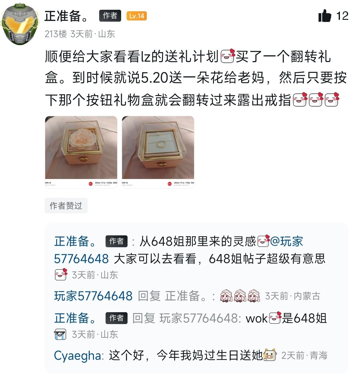 一开始是我故意挑起话题问老妈有没有给我准备520礼物老妈也是白了我一眼说:“也没见你给你妈买礼物,还找我要呢”然后我就顺势拿出准备好的惊喜盒子(Ps:这个盒子是有说法的我也写在我上一条帖子的评论上了但因为不能置顶看见的人好少我把评论发出来了,大家可以看上面的图)然后说我当然准备了呀,老妈看见我盒子里的花也是惊喜的呀了一声正当她以为完了后,只见我轻轻一按按钮“啪”的一声,礼物盒翻转,把金戒指露出来了嘿嘿