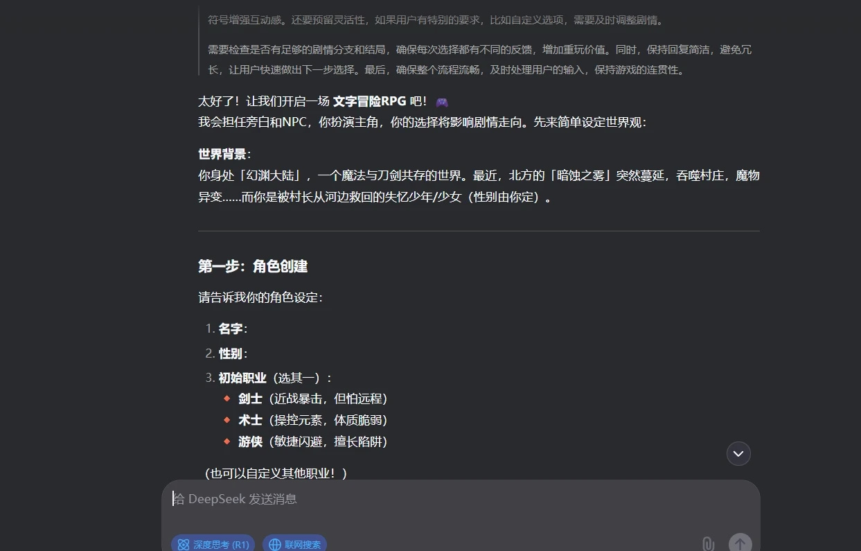在我把這篇文章寫出來前,其實我就已經把遊戲安利給我身邊部分朋友了,我跑去我之前加入到一個“文字遊戲”羣,這些老登現在在研究如何利用deepseek玩文字冒險遊戲,可能很多讀者不知道文字遊戲是什麼類型的遊戲,我也簡單介紹下,文字遊戲的運行方式就是通過純粹的文字交流獲取遊戲的流程和知曉我們現在的物資道具,如果說我們現在玩的畫面類遊戲比作動漫的話,文字遊戲就可以叫做小說。