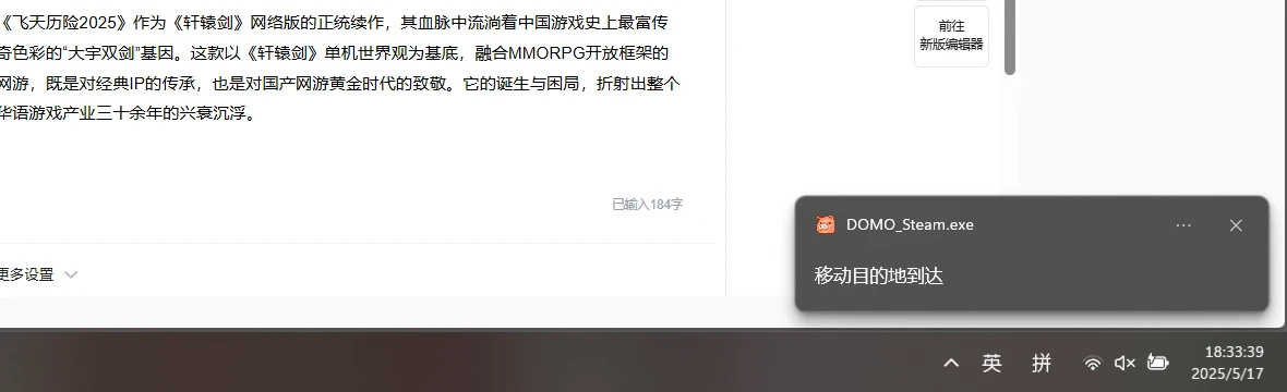 並且遊戲對於WIN系統的通知功能運用,我也算是頭一次見了,也可能是我太多年沒有玩MMORPG遊戲了,我把遊戲放在後臺趕路,win系統居然會提醒我什麼時候到達目的地,對於我這種網遊只有《雲頂之弈》算玩的多的玩家,是在太讓我眼前一亮了。