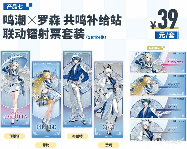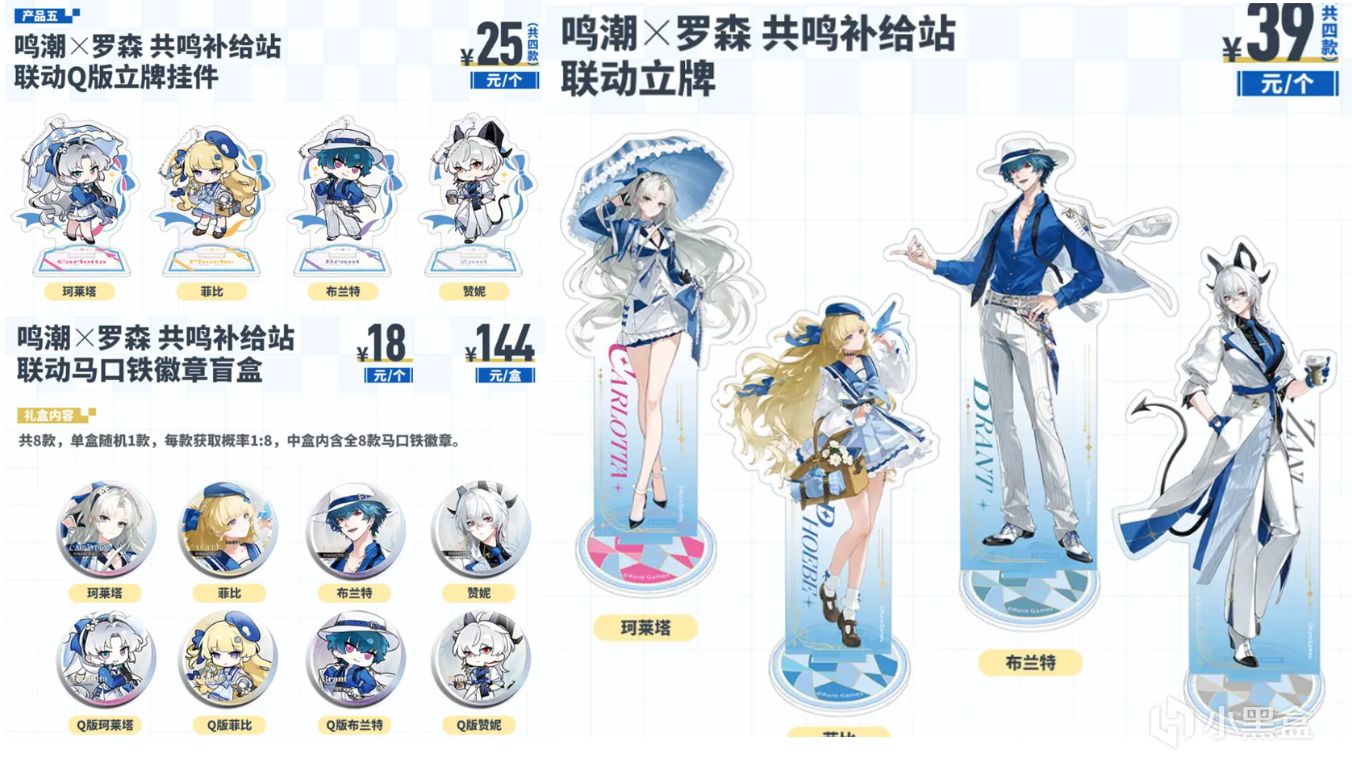 接下來向我們走來的是聯動老四樣——吧唧、掛件、立牌、鐳射票。吧唧和掛件這邊除了共鳴者們的新皮膚形象,本次聯動還做了四隻共鳴者的可愛Q版,哈基庫你這傢伙,上次聯動就做了2D動畫,這次糰子模式玩多了開始走可愛風吸引我嗎?不,其實是柯萊塔的大手!變成Q版大家就一樣高了!還有呆毛優勢,莫塔裏這招太狠了!