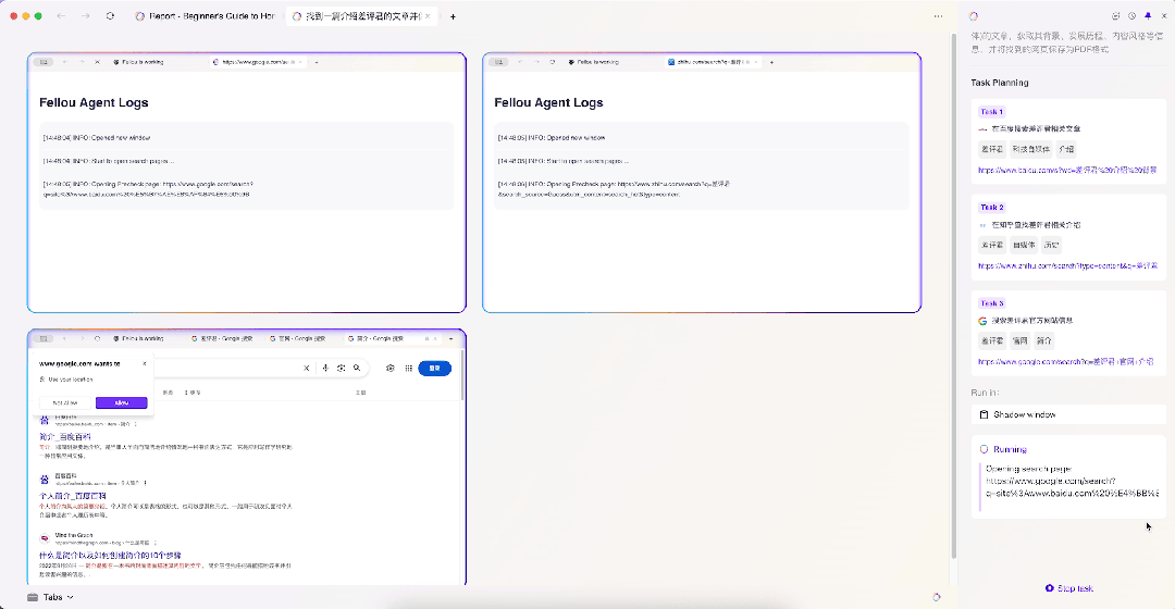 点击开始运行,Fellou 就打开了很多浏览器窗口。