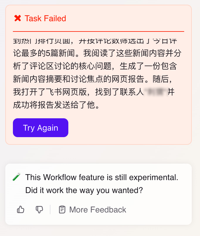 果然它用了 6 分钟时间,在这个话题下看了 2 个推特账号的主页,然后跟我说任务失败。。。