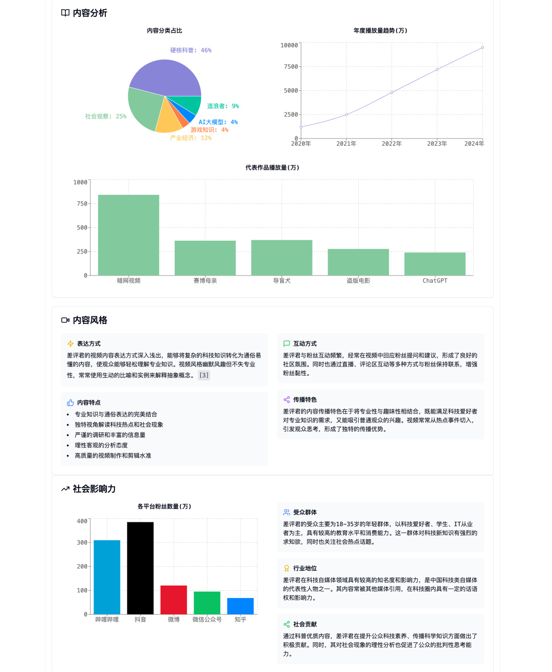 里面用图表形式分析差评君各个内容占比,平台粉丝对比,视频播放量,内容风格和互动方式。