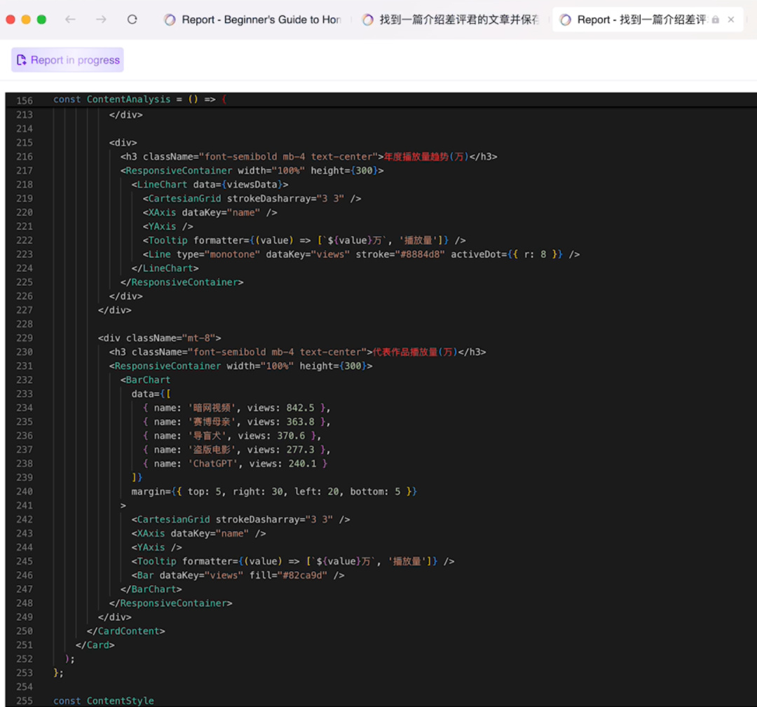 目测下来啊,它似乎还没有做成 PDF 的能力,只是每次在搜索结束后,会用代码写成一个报告总结的网页。