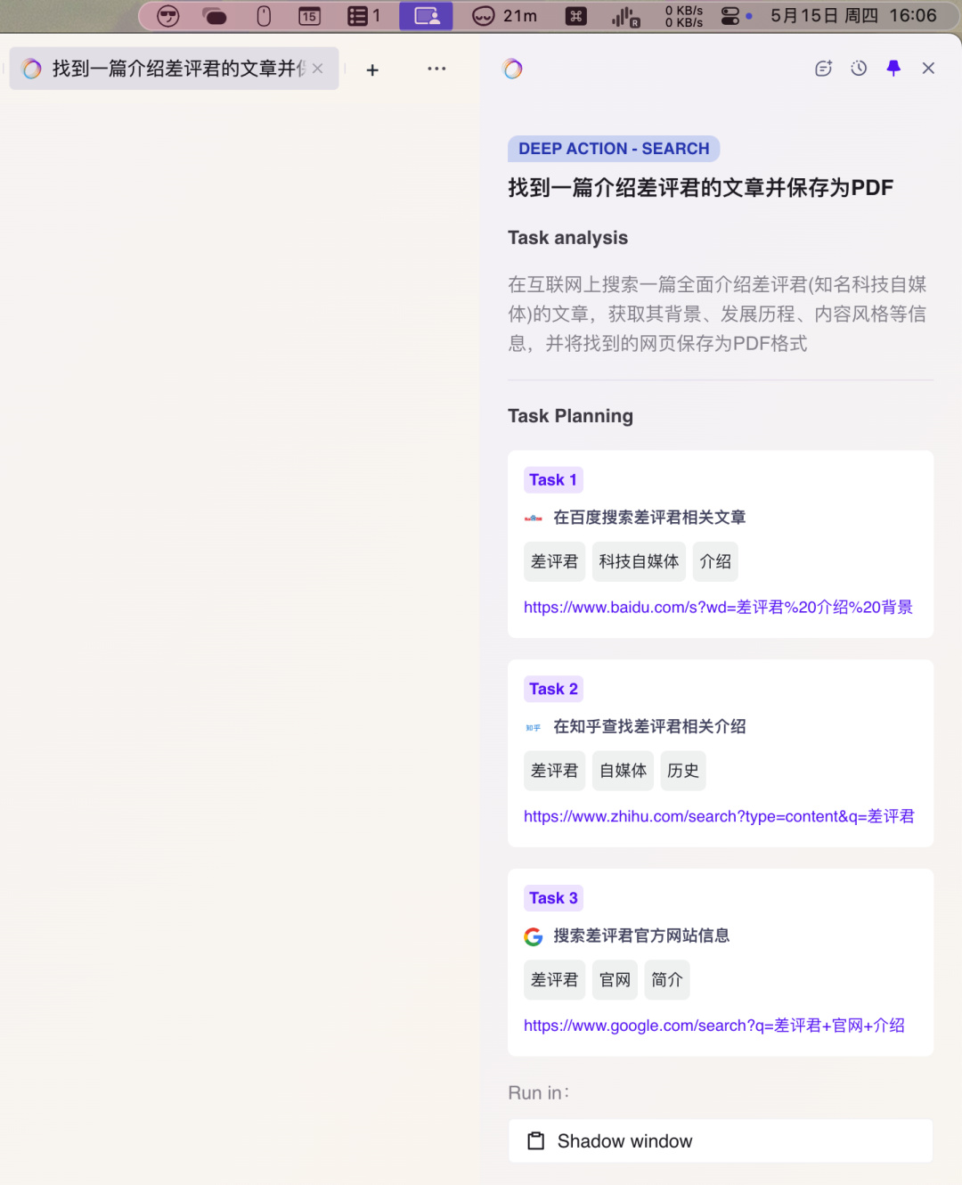 之后 fellou 就会在浏览器右侧给这个问题分步骤处理:在百度、知乎、谷歌搜索差评君相关信息。