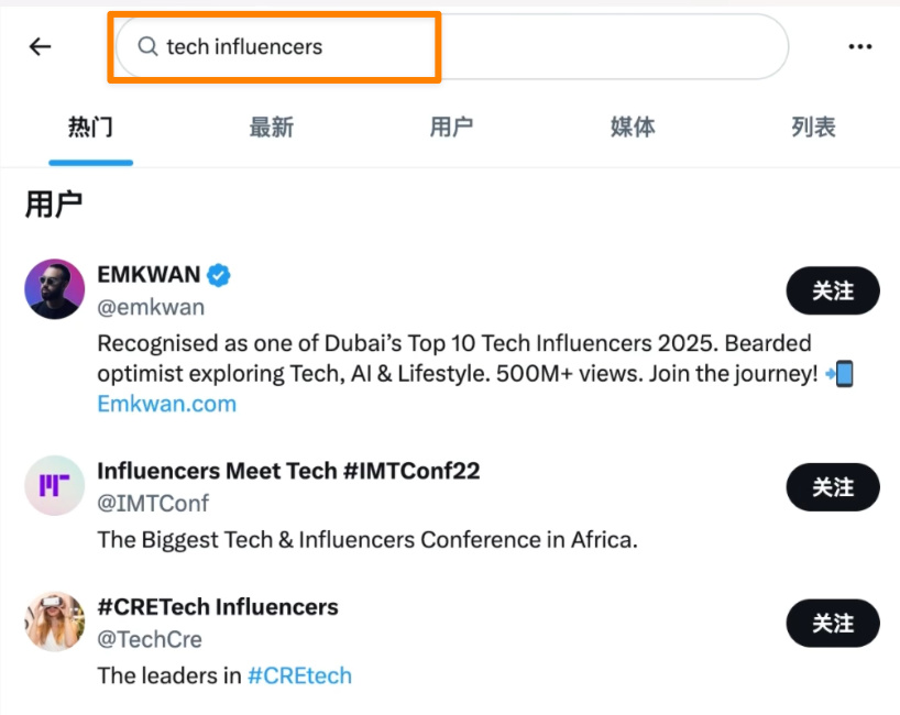 比如“帮我找出过去两周内曝光量超过5万的10位科技领域推特KOL”,并关注。