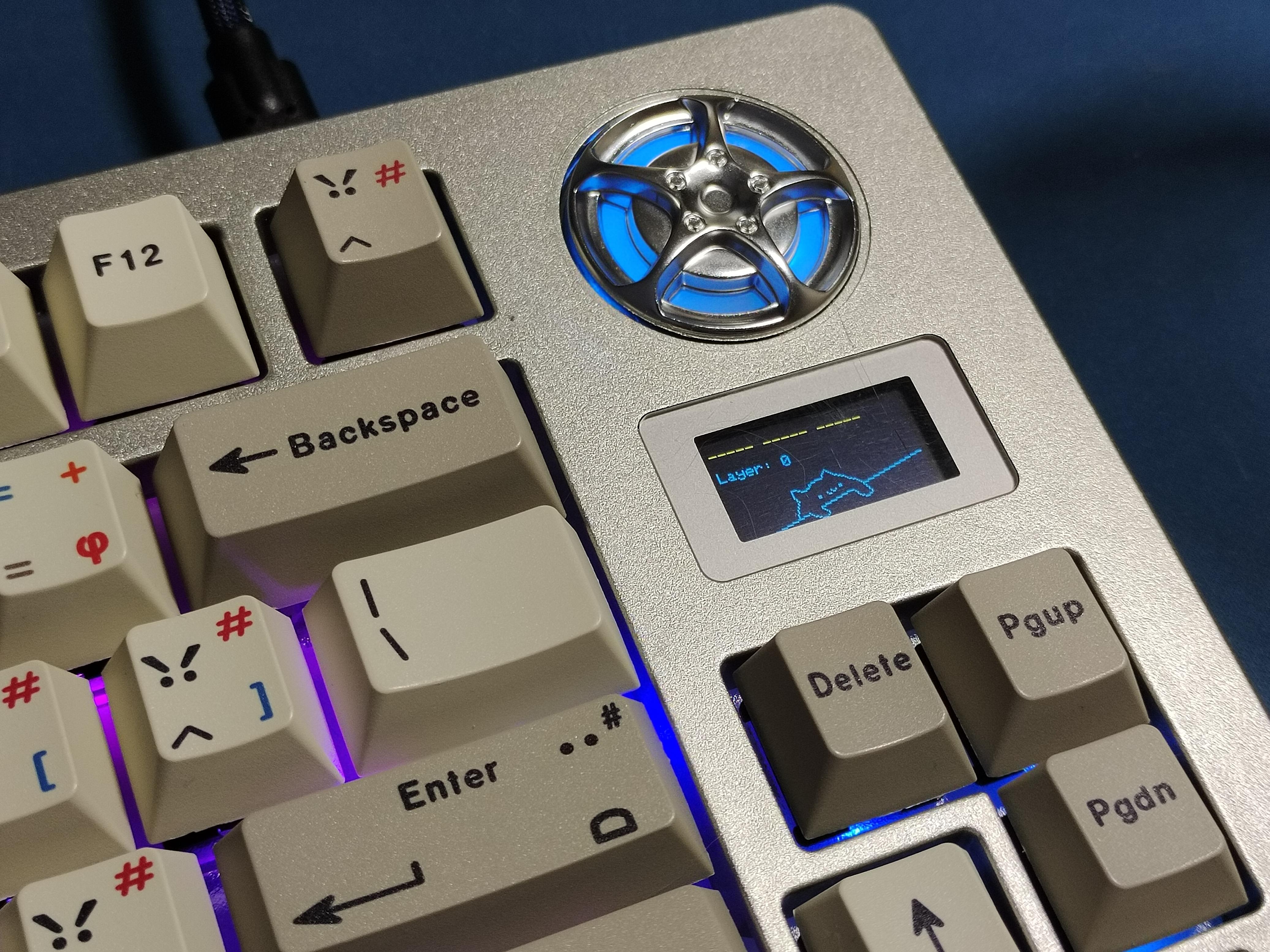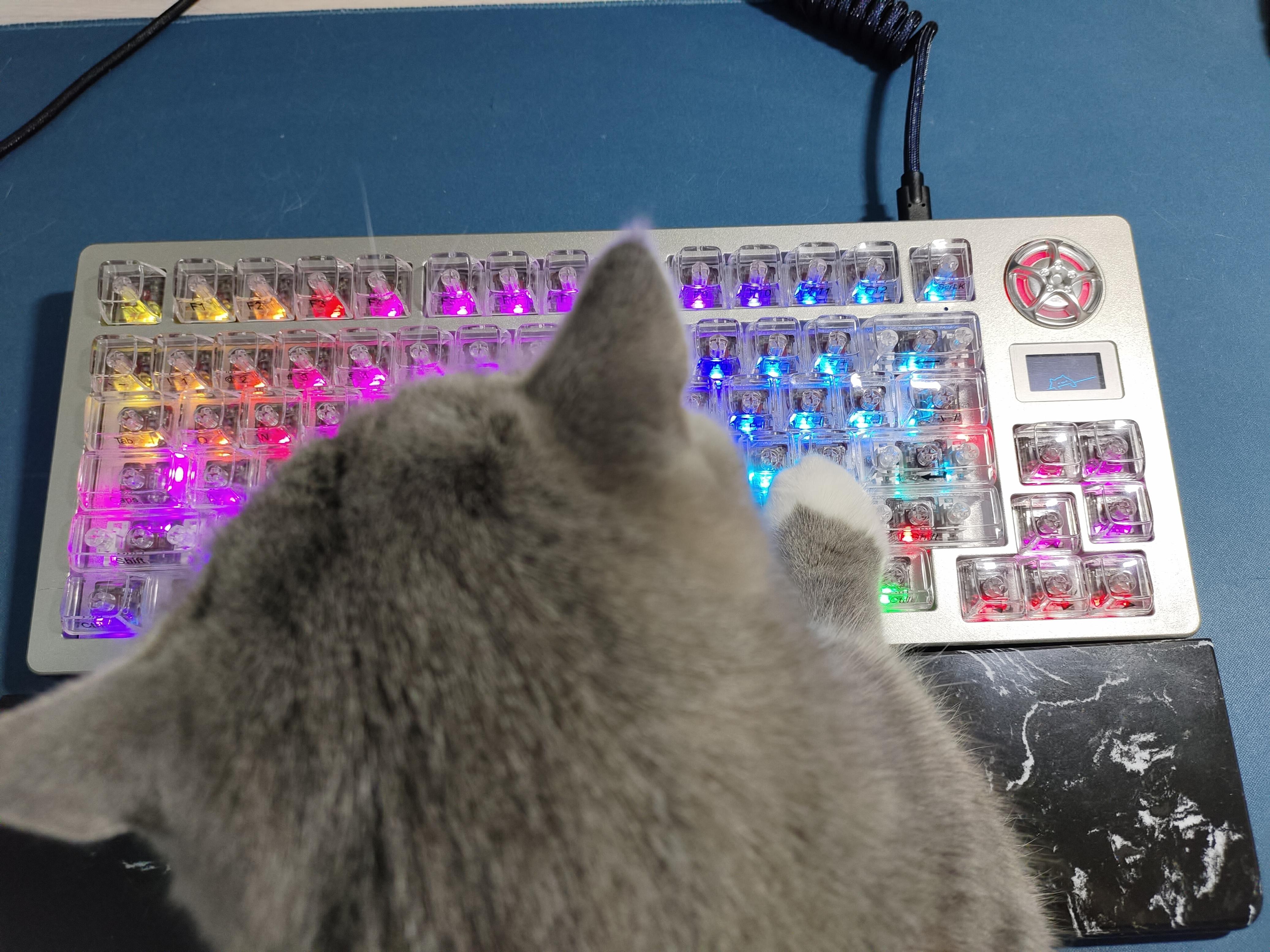 在鍵盤右側設計了旋鈕和屏幕,車輪狀的旋鈕下做有和鍵盤一同閃爍的RGB燈光,屏幕則相對簡單,上方是按鍵鎖鍵的指引燈,中間顯示目前鍵盤所在層級,如果按下fn就會由0變爲1。最下面則是一個可愛的貓貓動畫,會隨着按鍵在屏幕裏敲打桌子。