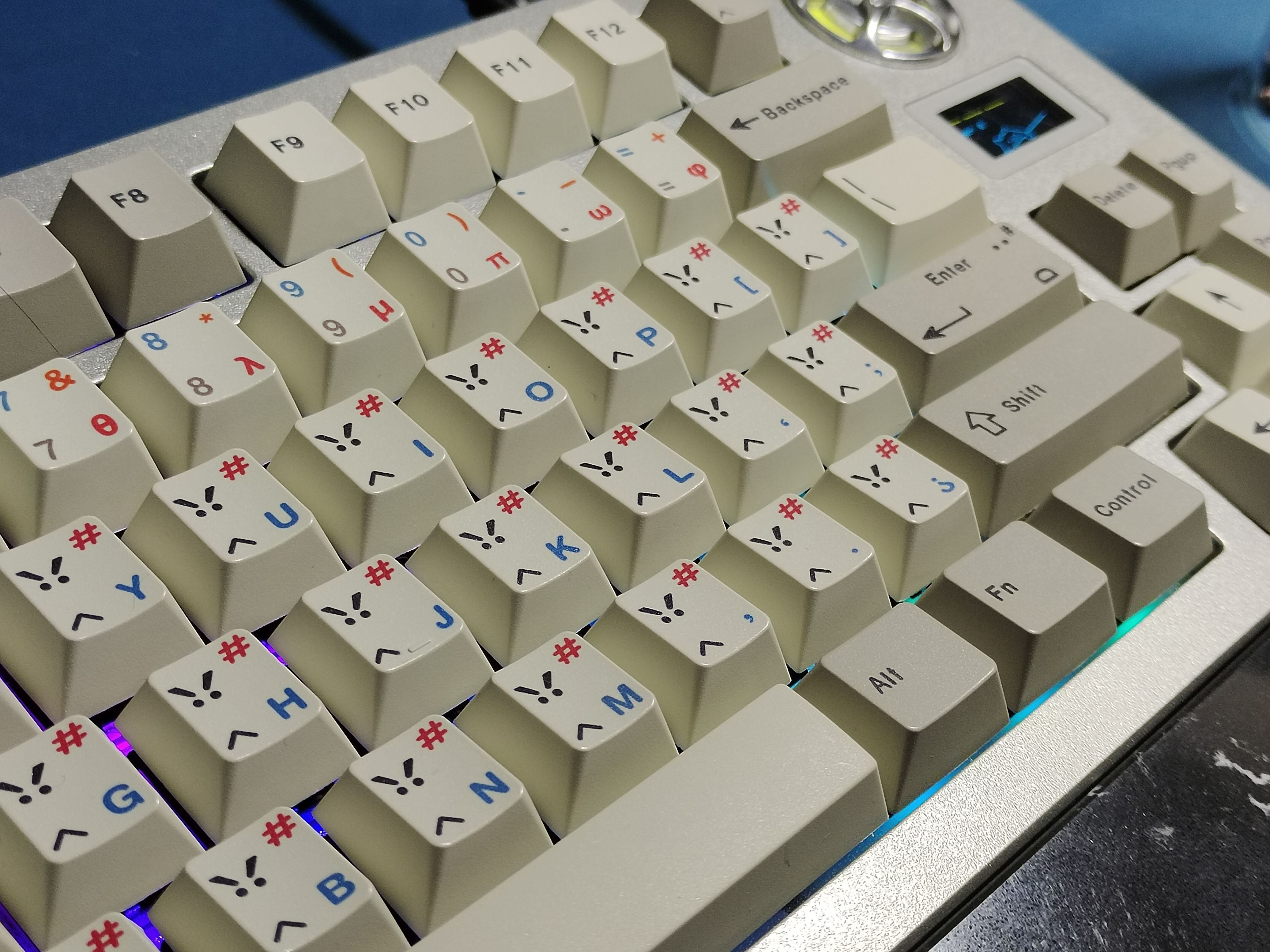 鍵盤的佈局也很有意思,不同其他75,其主鍵區按鍵大小和80%配列一致,包括右shift都是正常長度。但方向鍵上方卻並沒有做常規75%愛用的豎列I字而是L行的結構。其實這樣有很多鍵帽因爲高度問題是不配適的,不過反過來想想,不用R1R2高度的那幾顆按鍵,換爲R2R3高度立馬就解決問題。